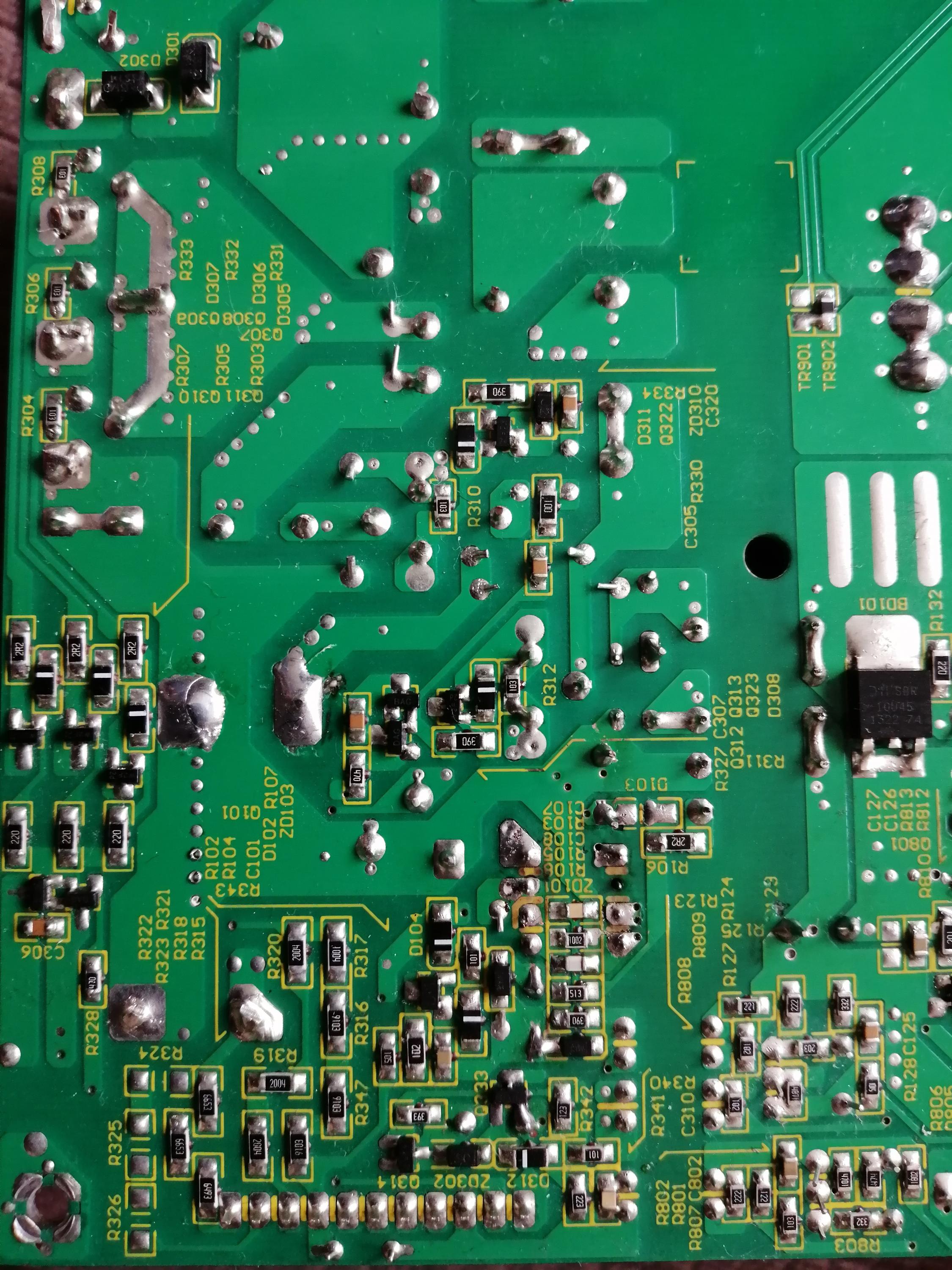 Fast forward to yesterday, I had some free time to poke it with a multimeter and I noticed a broken diode. The solder mask under it was cracked and separated from the PCB as well.