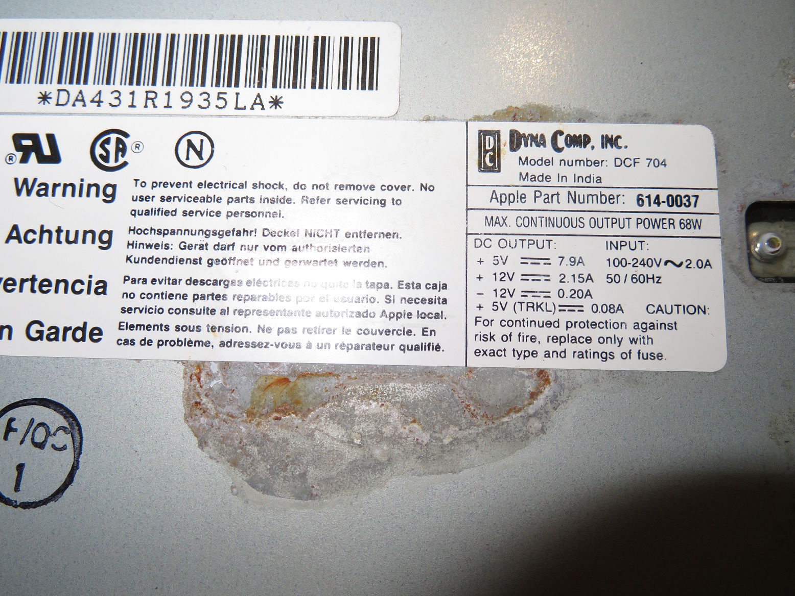 I did Google for info but I ran into a problem: all the info I could find on recapping similar power supply, those were Antec brand with different capacitors. Mine is Dyna Corp but uses the same Apple part number. Google didn't turn up anything useful other than air filter. I guess I got a rare variant?