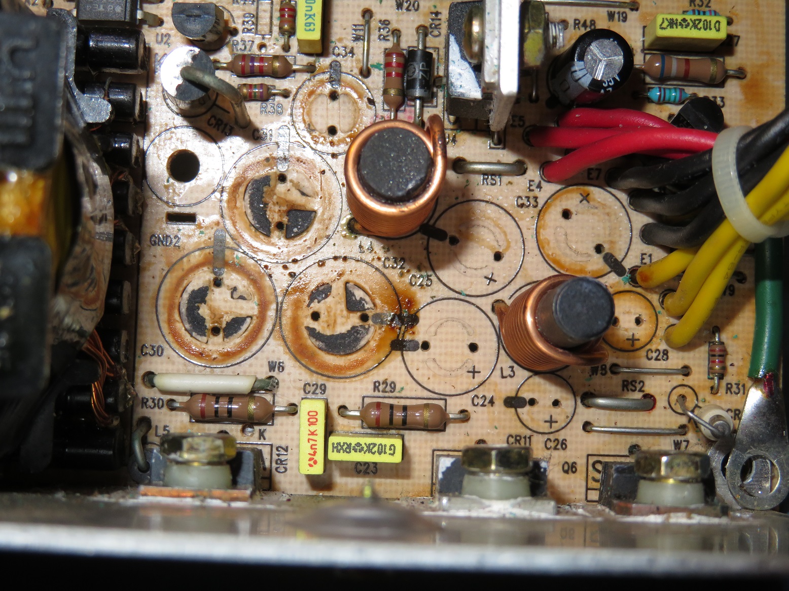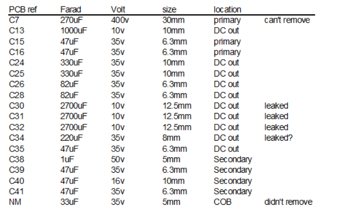 After I desoldered all the caps (except for 2, one on COB the vertical board with chips near DC out rails, and one honkin' big cap near AC input) and there's residue that looked like 3 or 4 caps had leaked by the DC out rails