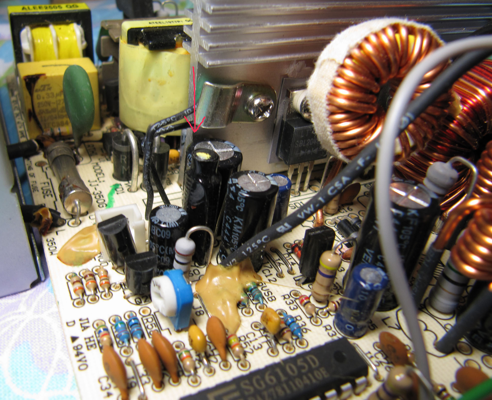 I think that the 5VSB is regulated by an A6069H PWM chip (which was initially dropping to 2.5V even before the the PS-ON was grounded - but it now stays at...