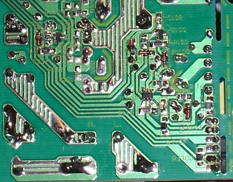 Next big project is an Antec SU-380 with blown fuse. Of special interest is the 5vsb surface mount IC on the bottom of the pc board. Can anyone identify it???
