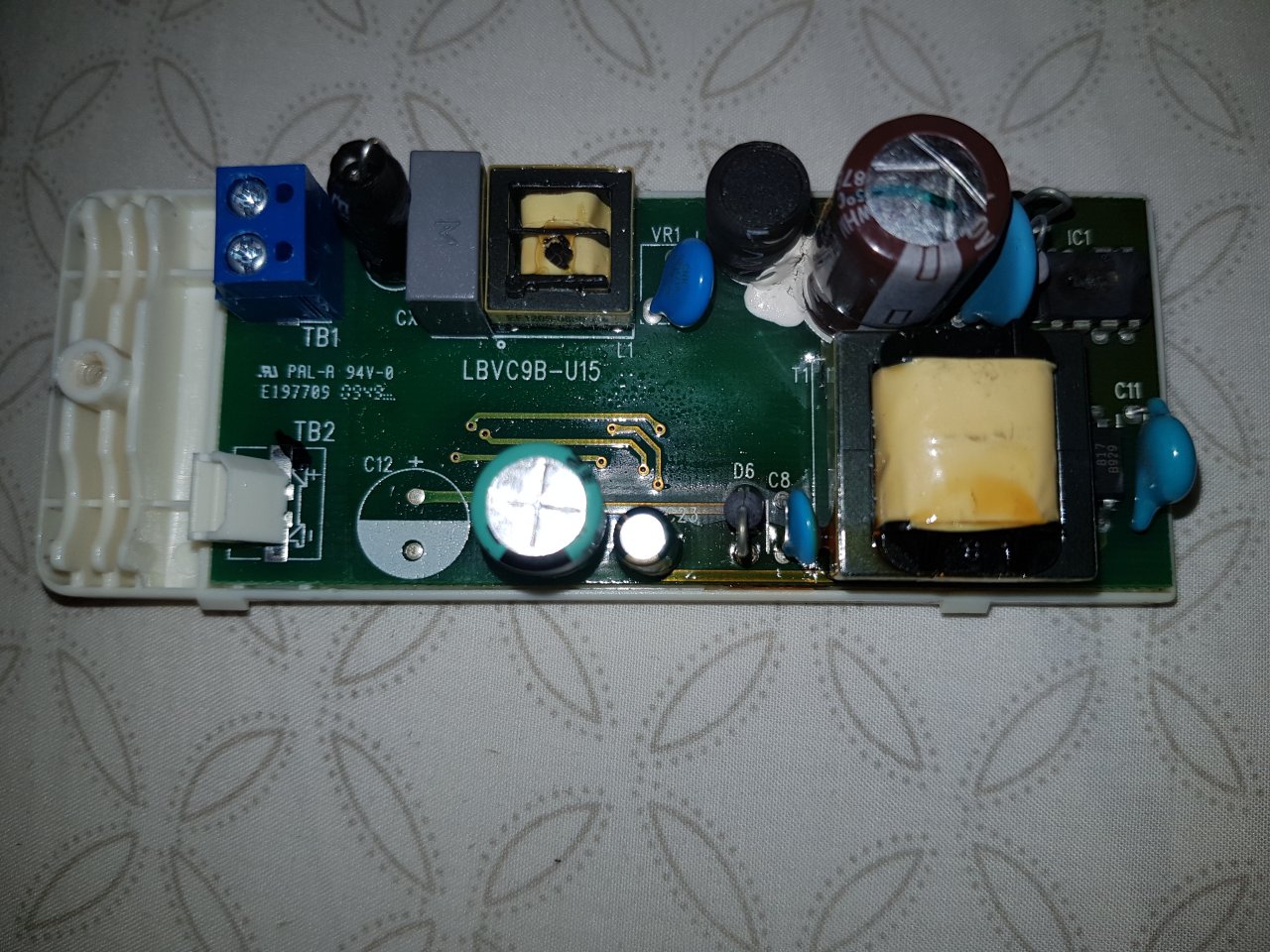 This unit had approximately 50K running hours before it failed; upon opening, a bulging (and heat stressed) TK UTWHM series 450V 10uF unit caused the TOP278 IC to blow its top off.