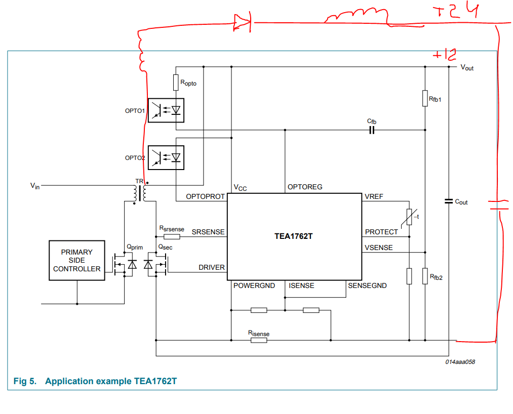 The topology of this PSU is a combination of fly-back and active rectifier converters, based on TEA1762T. The possible schematic is in attachments (it's my assumption because I've not found any information)