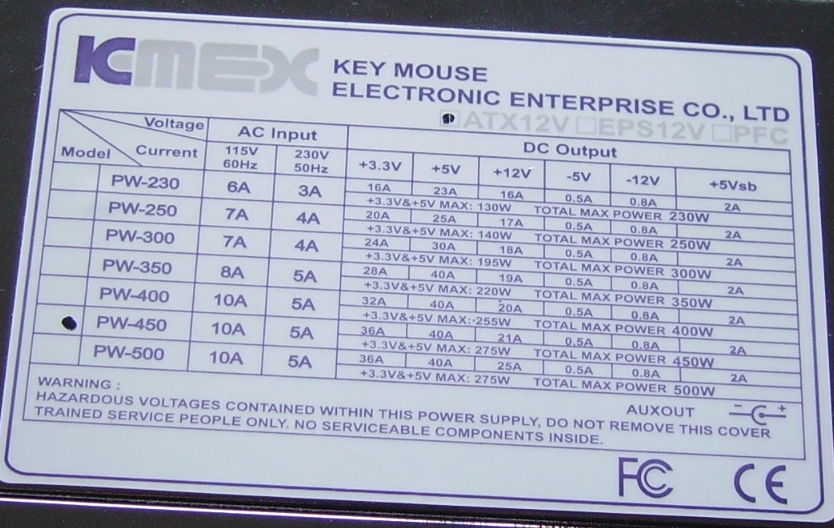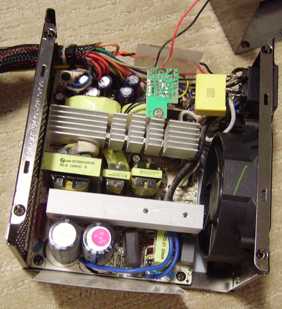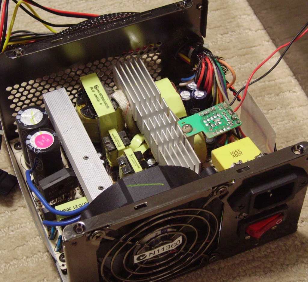 In spite of the no-name sounding brand, this PSU actually looks half decent. The promary caps are 680uF HEC brand. We have a rectifier, not 4 diodes. The transformaers are a decent size, as are the heatsinks. The components are all there (none missing). The secondary caps are all fuhjyyu brand