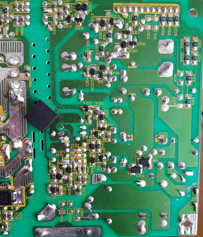 I replaced a 1.1M surface mount resistor (R322) in the PFC VSENSE divider with a 1.0M resistor. The resistor in question is shown in the top right in the attached photo. I barely managed to squeeze in a 1/8W through-hole resistor in the space provided (didn't have any surface mount components at hand). This reduced the PFC output voltage to 372V, which provides enough headroom to the overvoltage protection level. The power supply has worked fine since this replacement.