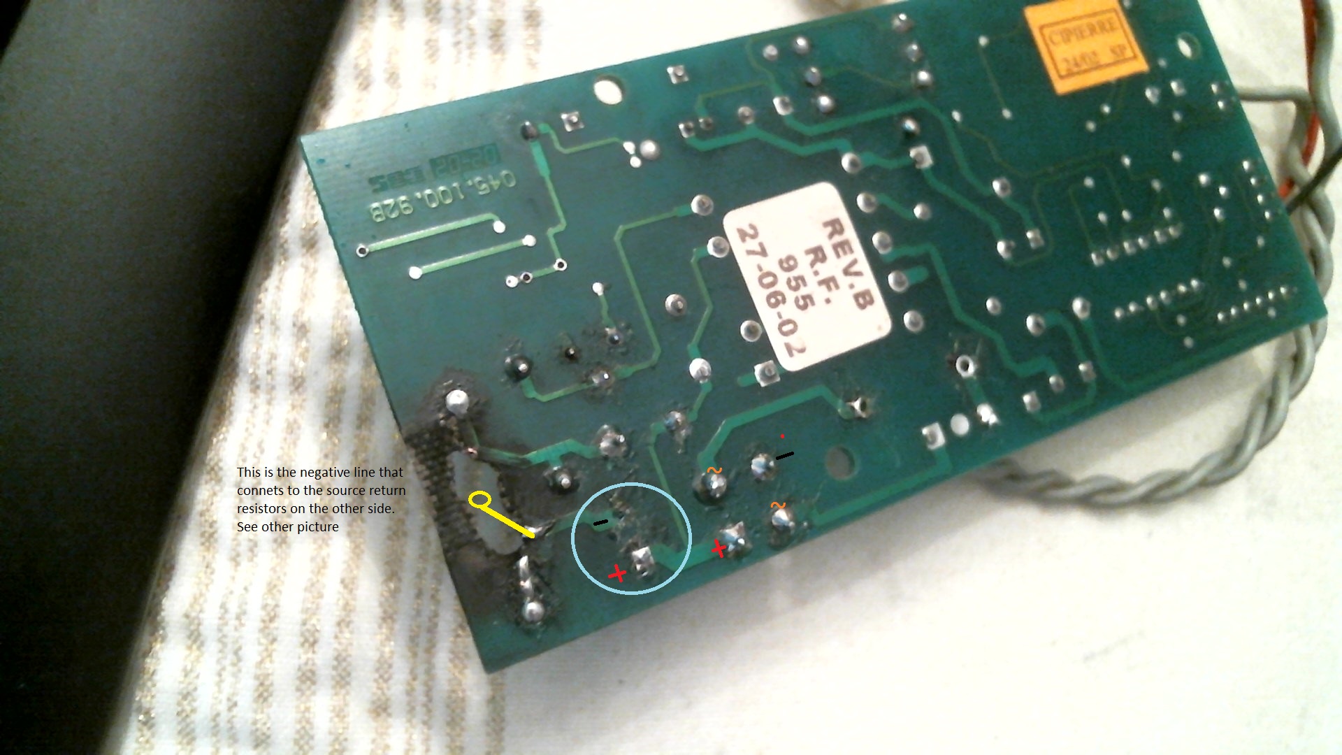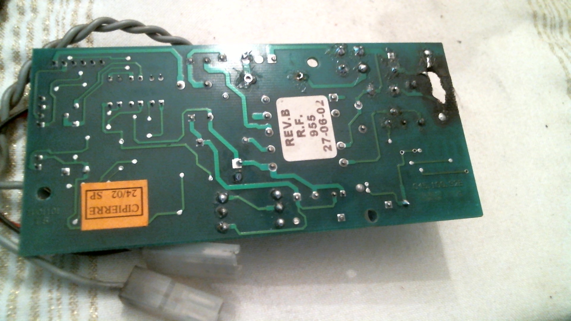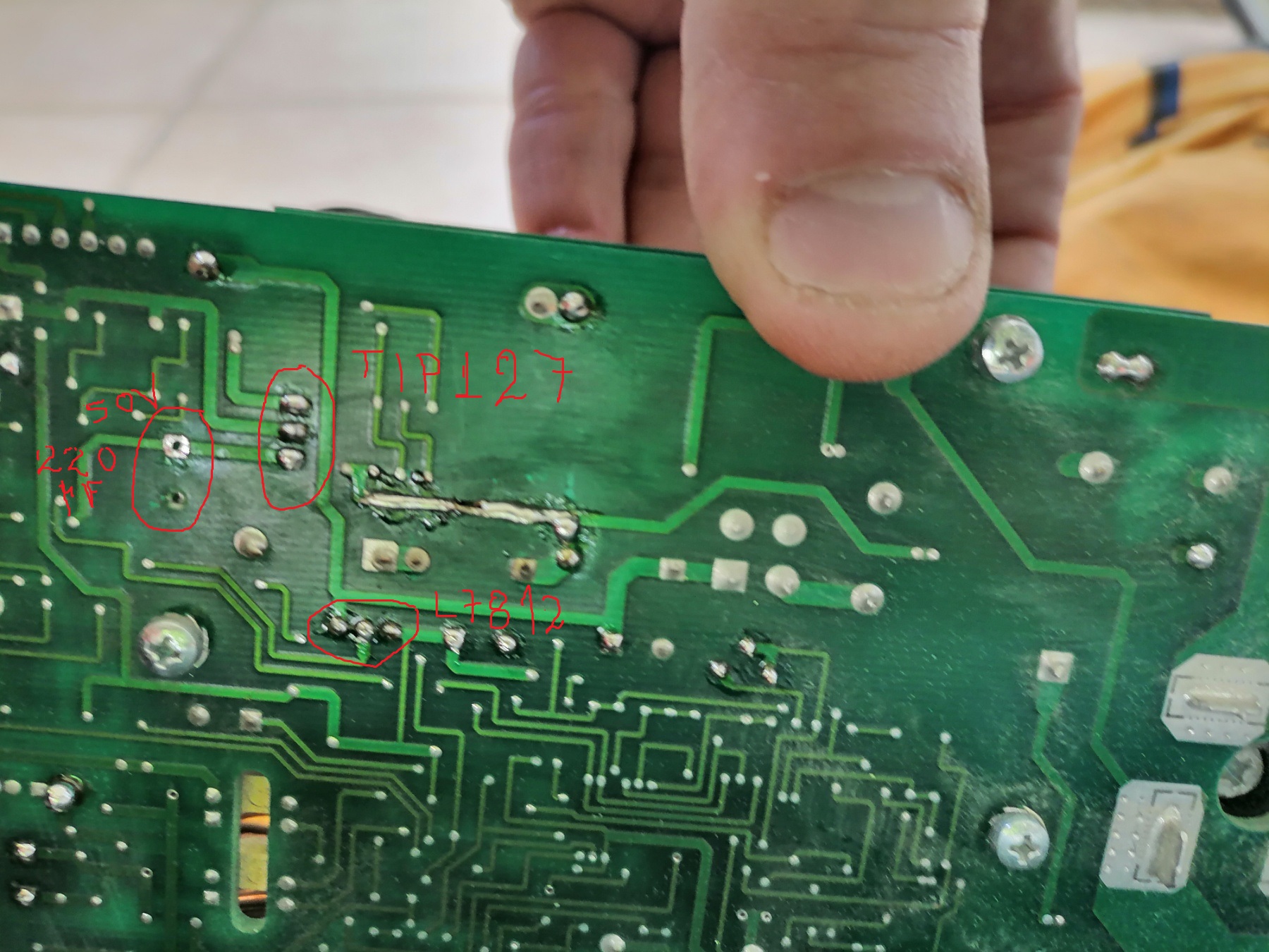 i have found on the pcb on the bottom a rail which was burned ....i see a resistance with crack on it the green one which i dont know its resistance the letters are not recognized..and the capacitor behind tip 127 had leakage after i start up the machine without change the resistance. i check it with multimeter and i saw 48ohms...the others are 6kohm ..eachAttached Filesif you find these attachements useful please consider making a small donation to the site