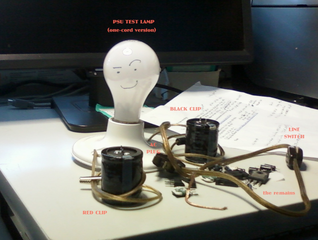 My test lamp was derived from Toasty's circuit. It uses a scrap of lamp cord. One line (red clip) goes through the bulb, the other (black clip) goes directly to the PSU.