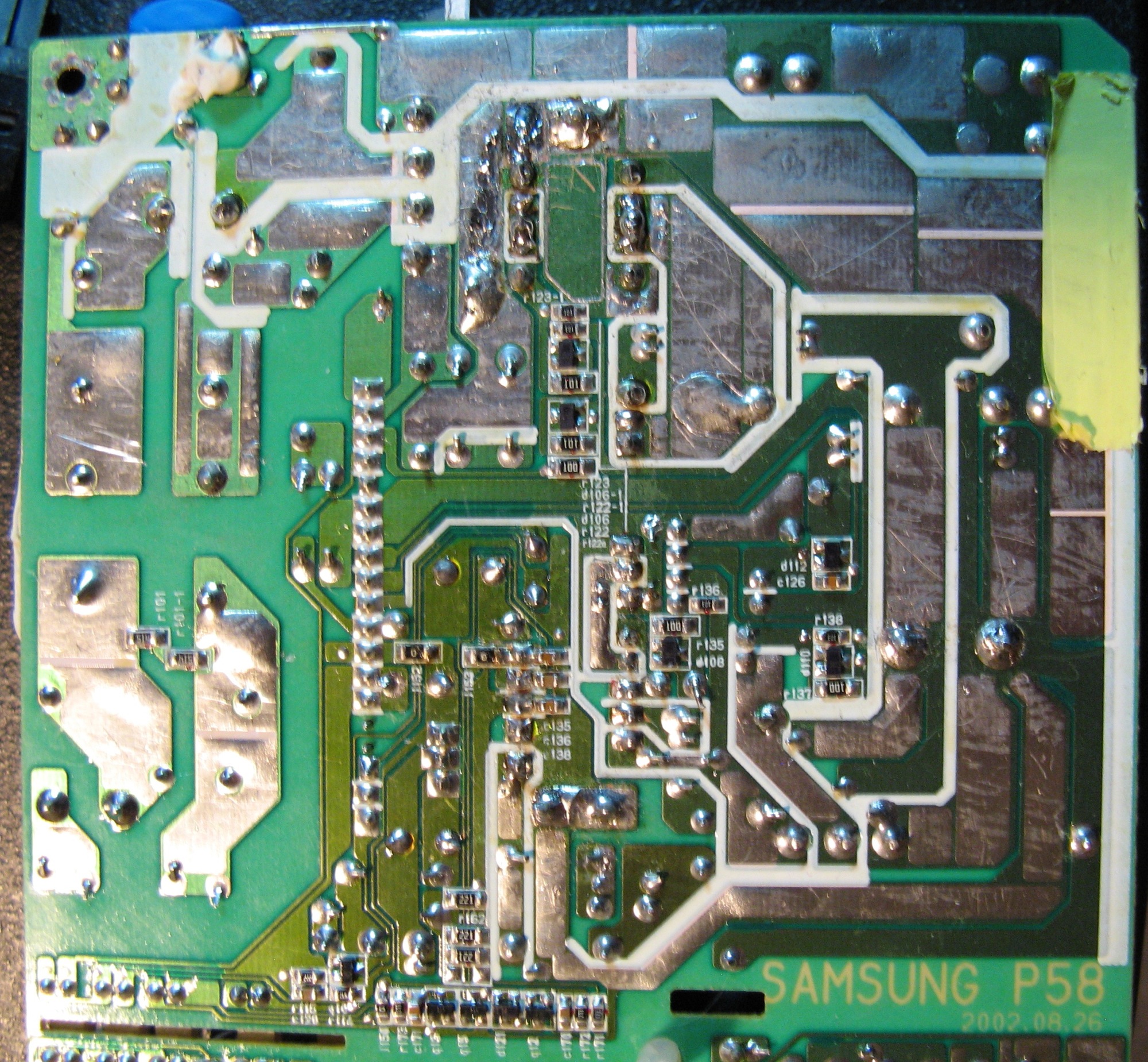 I may have damaged a trace or let solder flow where it shouldn't, especially top center in the area of the single post of the heat sink and the pair of Mosfets. The board has a hacked at look, huh. I plan to pull another Samsung PSU as a guide to de-blobbing. Comments would be greatly appreciated.