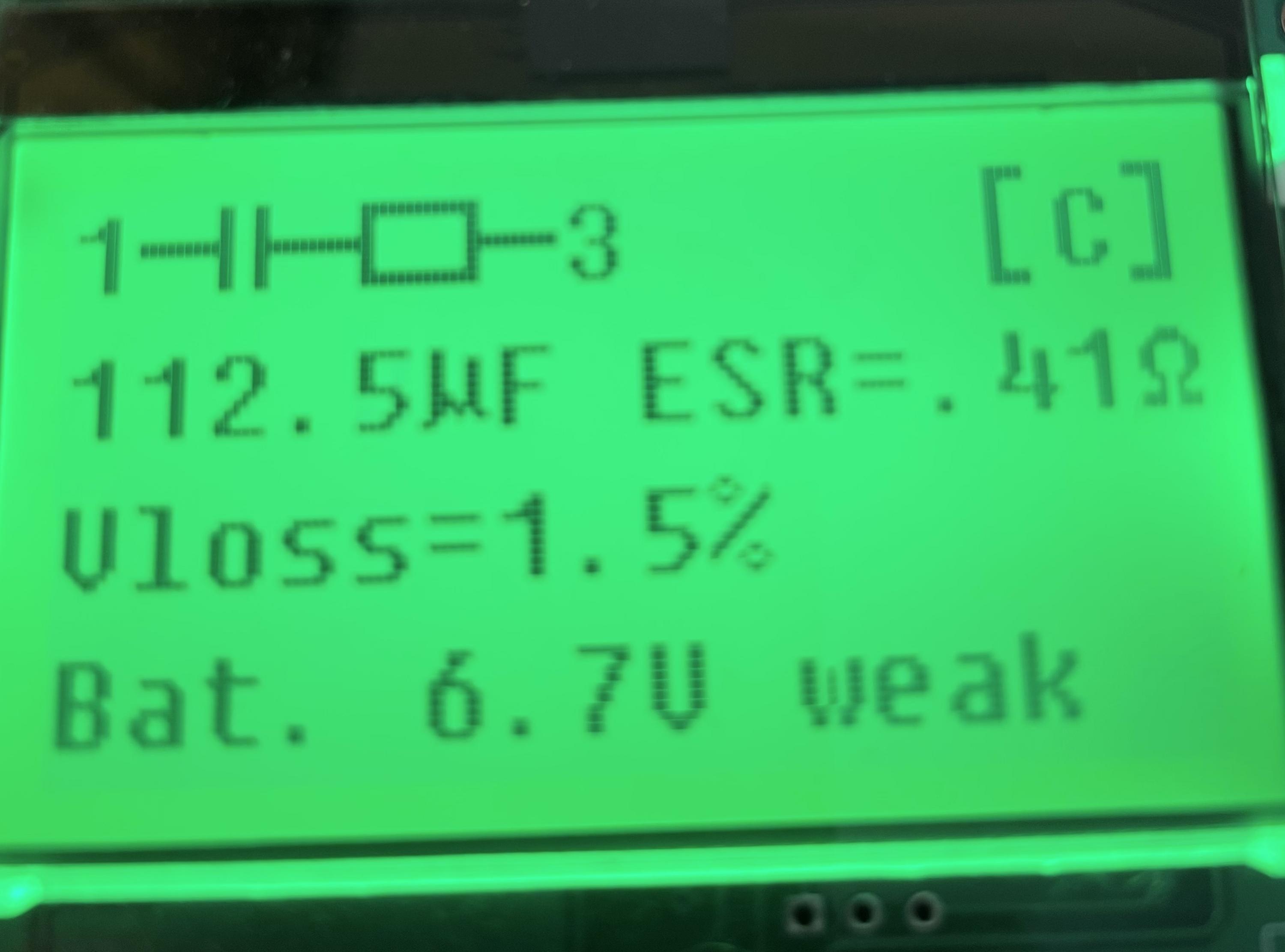 Measures: 948,1 nF, ESR = 2,4 Ohm, VLoss = 0,4 %