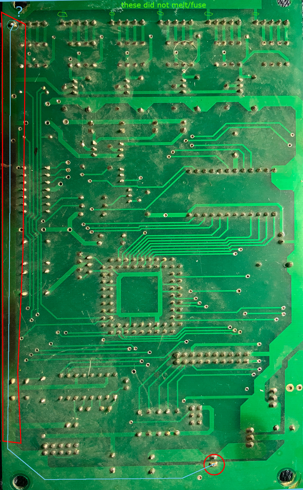 Also, I can't see the end path for the hot pcb trace on the controller board, this is strange. Follow the blue line from J3 to whatever. It should have fused/melted the little traces if the LED driver boards were pulling high ground current - wait... I suspect it must be the first connector (board) that was drawing the high current. I suspect this one connector leads to the shorted culprit.