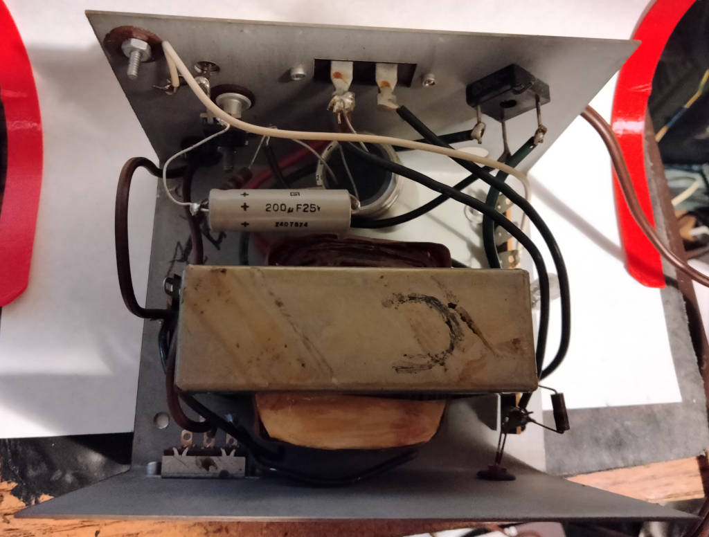 BTW, schematic: nothing much to it. Just two NPN transistors (TO-3 outside, and a TO-220 attached funny on the inside) wired Darlington. A 12V (assumed) zener with a 1K dropper resistor, and a 200uF filter across the zener. LED has a 1KΩ dropper resistor too. Main filter cap is 4.7mF. Not much else is in this PSU...