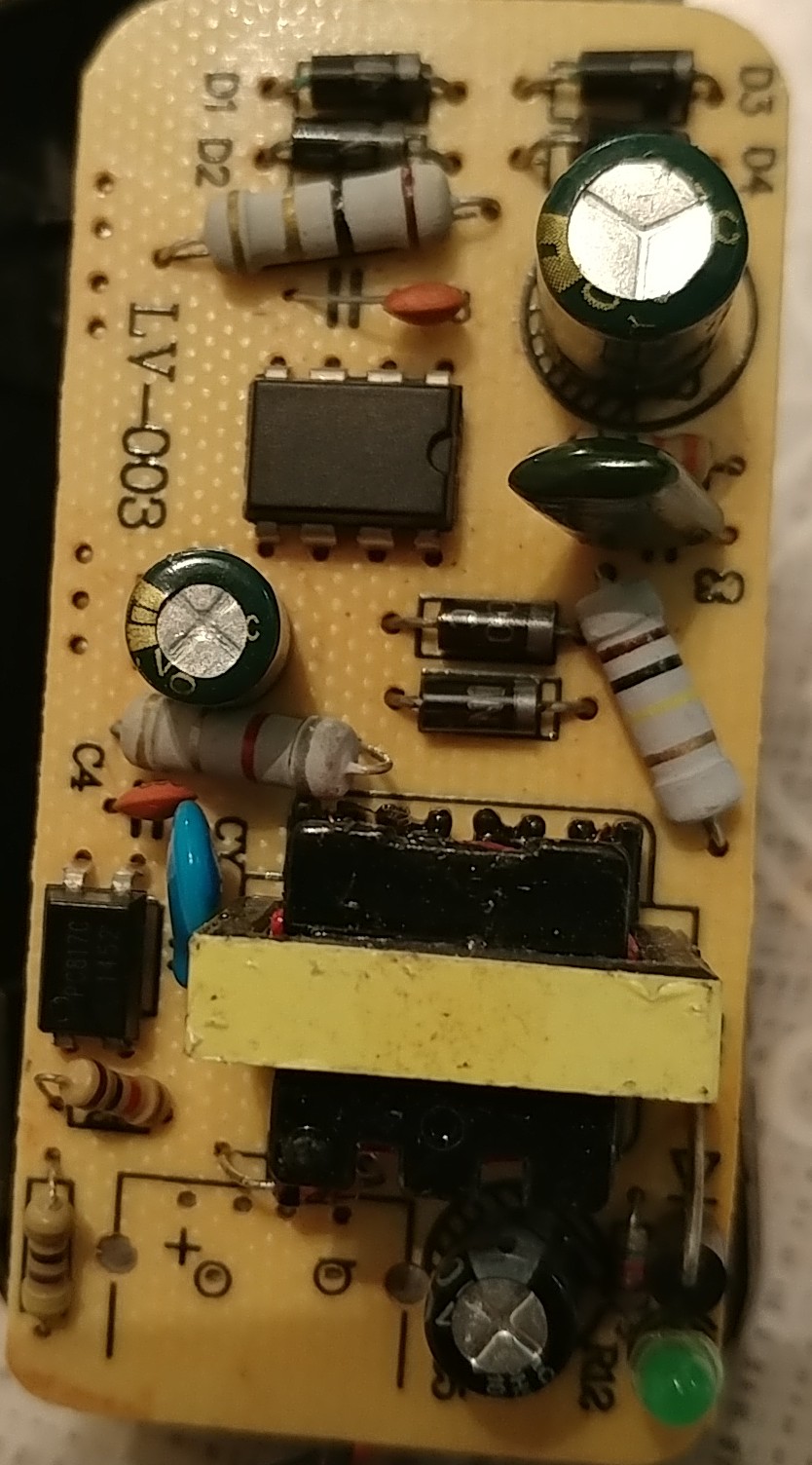 Attached is a picture of PCB. There are two black IC s on the board. The smaller one 4 legs is probably a voltage feedback chip. On it is written something like: PC817C 1452, and I cannot see that anything is written on larger 8 legs chip.