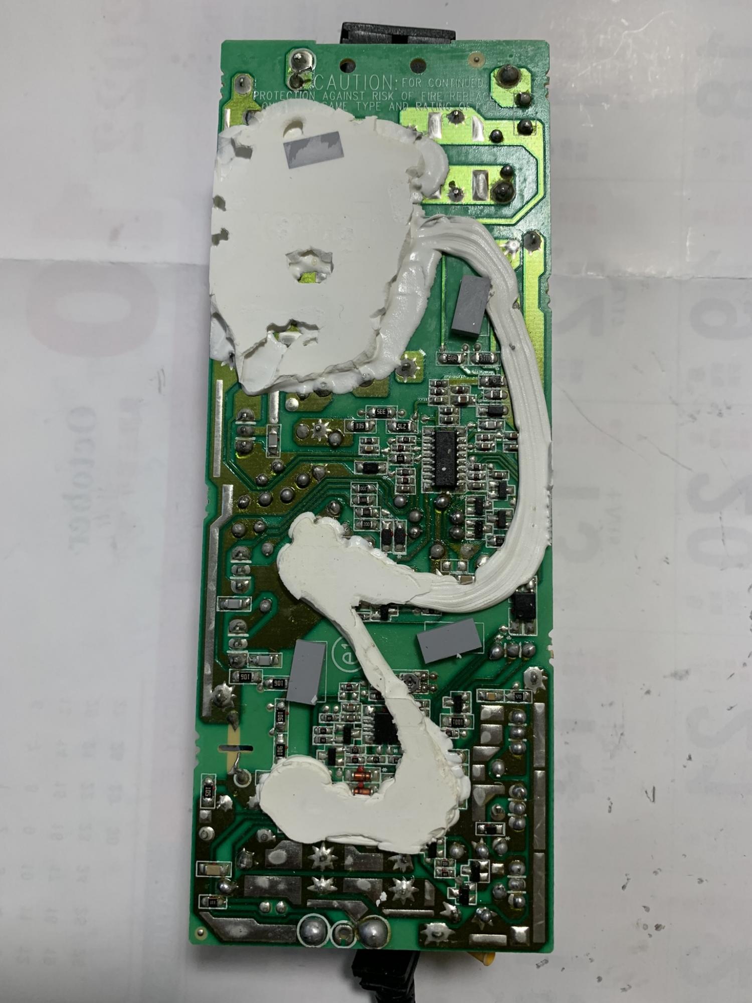 On the 20th time of turning on the computer, I got the power adapter no power out again after running for about 8 hours. I will proceed to removing the silicone and replacing the two small capacitors.