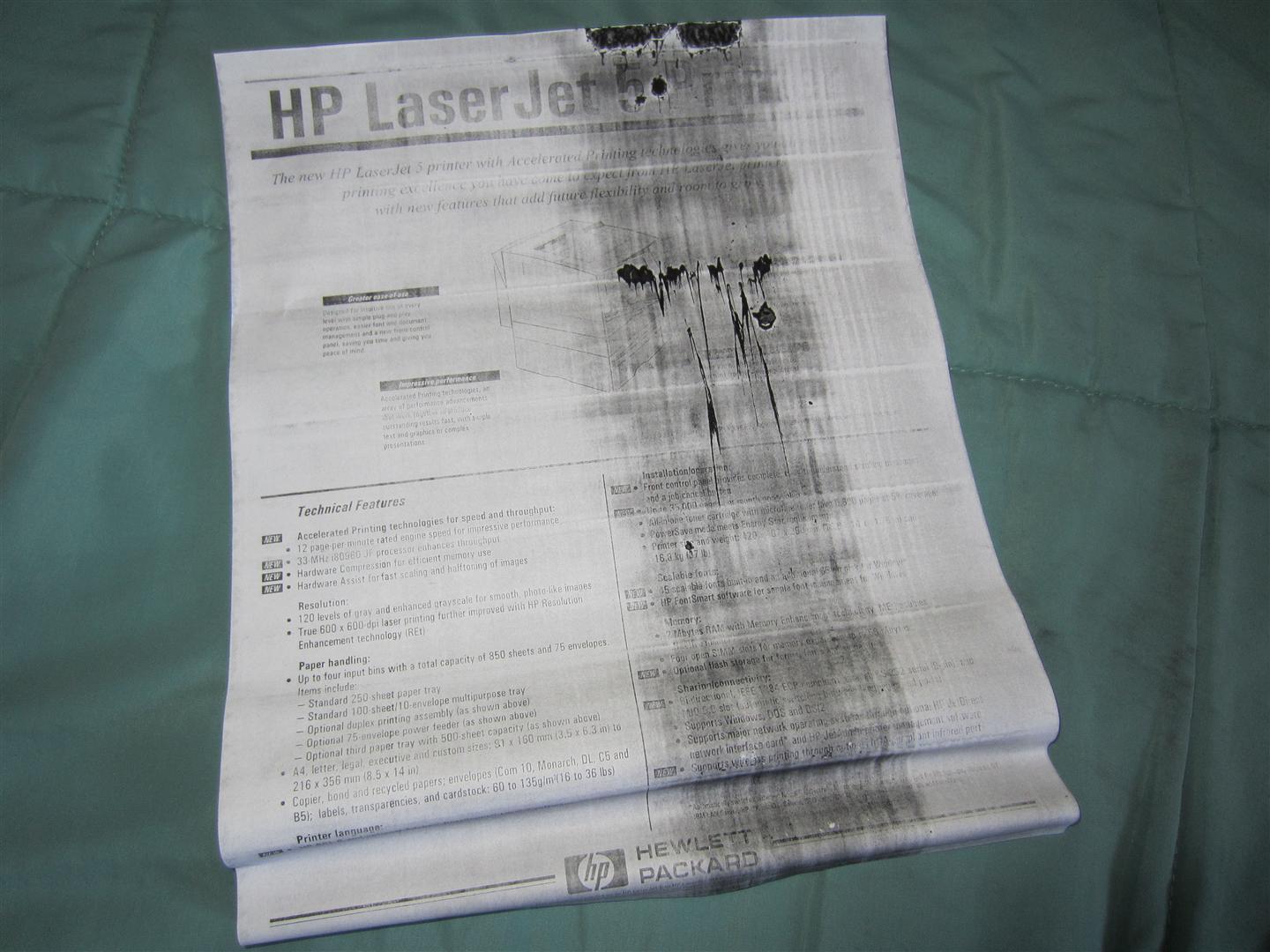 It powers up and prints a test page, but it makes an accordion paper jam and the printout is faded and has 2" gray bands going through it. The toner cartridge in it is completely empty.