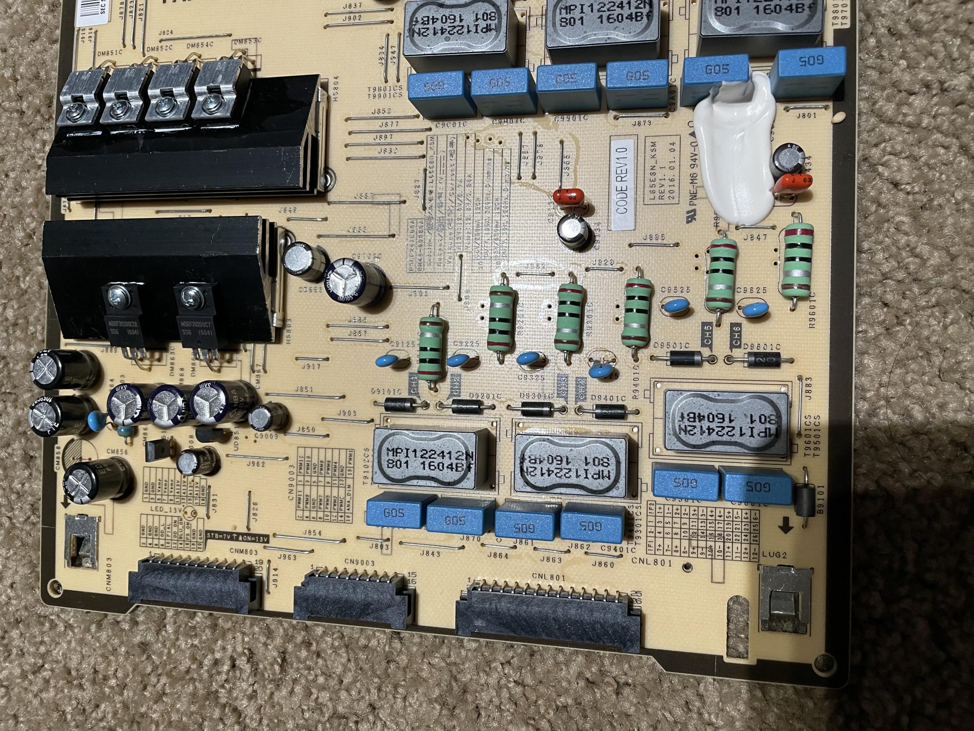 Hello, first time posting on here. I look forward to being part of this community. I have a 2016 Samsung 65" 4K UHD Smart TV LED item number: un65ks800df Issue: No power or standby power My diagnostic thus far: No standby power, no power, no backlight when power is unplugged to the main board. Wall outlet had 120 v, power cord has 120v. There is no obvious signs of burnt parts, there was no known event that caused the issue. I found the ceramic fuse blown (bottom right of board) and one capacitor to be puffy (top left of board). Replacement parts ordered. I’m comfortable soldering and desoldering. I have a Klein multimeter. While I’m waiting for the new fuse and capacitor. What should I test next? I assume the fox isn’t as simple as replacing the cap and fuse. Pictures provided. Note - I desoldered the puffy capacitor and fuse already.