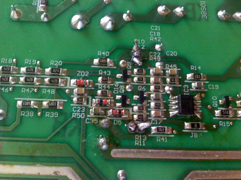 The first pic is a pic of the power board and mother board.. Second pic is of the bad caps.. third pic is of the replacement caps.. pics 4 through 8 are just clusters of things on the back of the power board.. pic 7 I circled something that looked darker than the others, could this be bad?