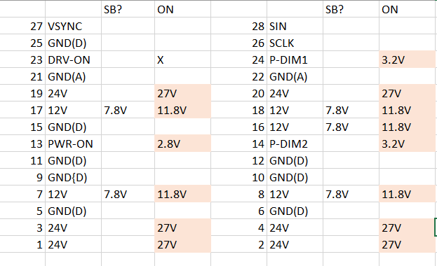 j) Disconnected mainboard from power supply. Put a 11k resistor on PWR_ON and one on DRV_ON. Connected these both to a 3.5v supply. Note that there is every possibility this isn't the right way to do this? Result = all backlight LEDs seem to go on.