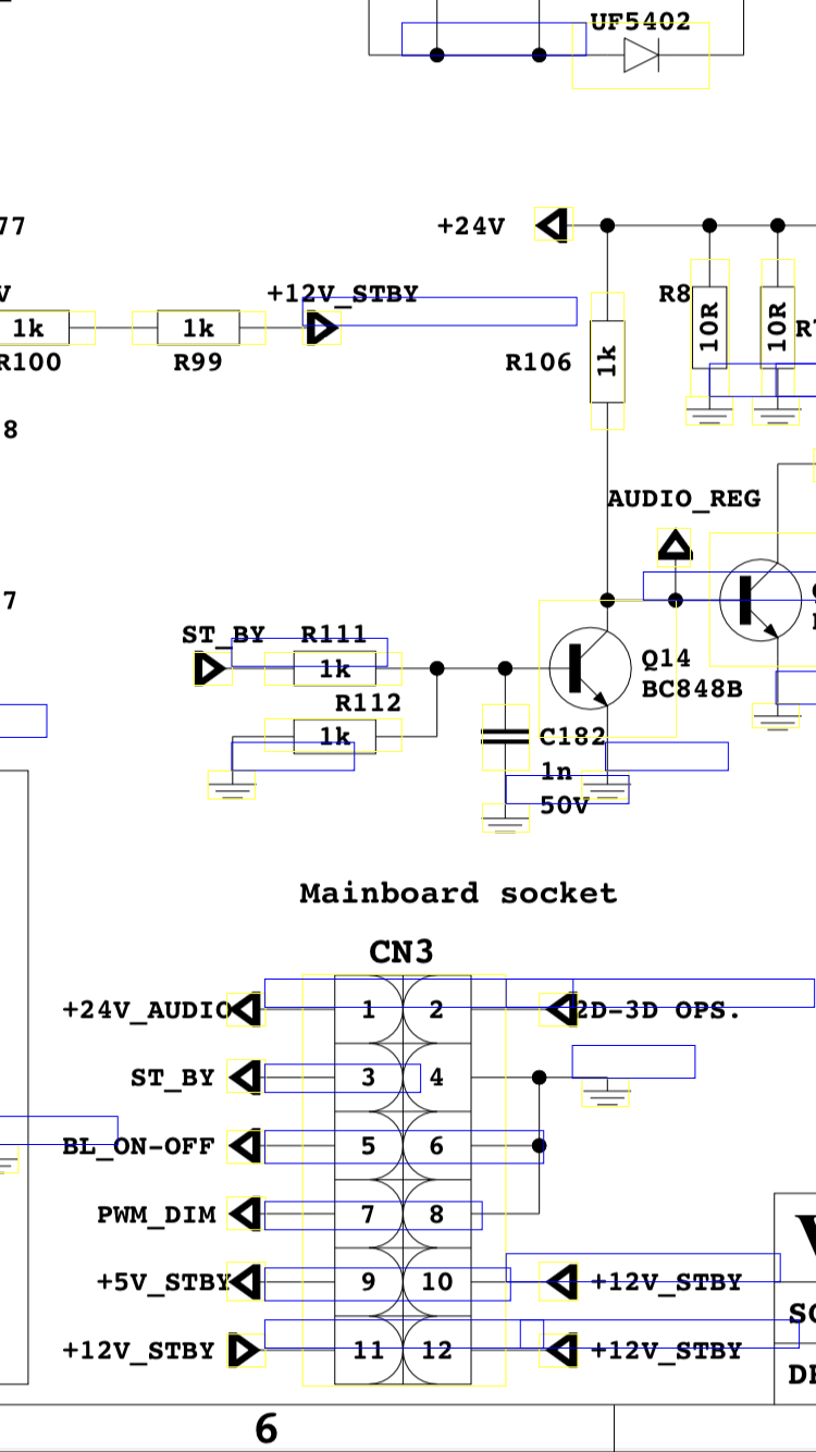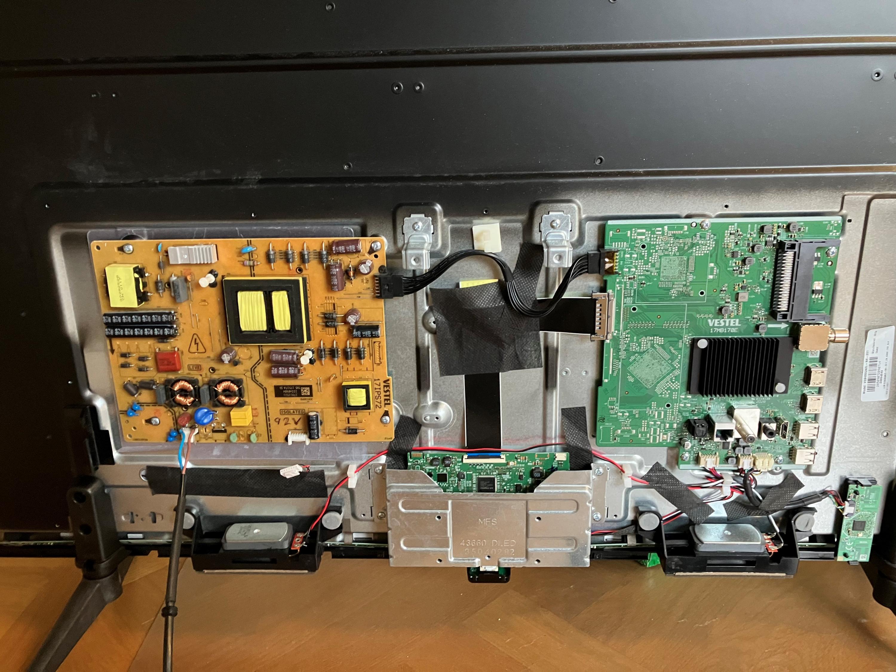 It has a Vestel 17IPS72 power supply and a 17MB170E board as seen in the picture. It seems like all outputs on the black connector are giving the correct voltage, 5, 12, 24v etc. However, when I load the 12v output with a 12v 5w lamp, there is no light and the voltage drops close to zero. I am no electronics pro but I looked at the capacitors on the board and couldn't see anything wrong. I haven't made any measurements on components. The voltage of the white connector(going to the background light?) is around 4-5 volts when its cable is not plugged in