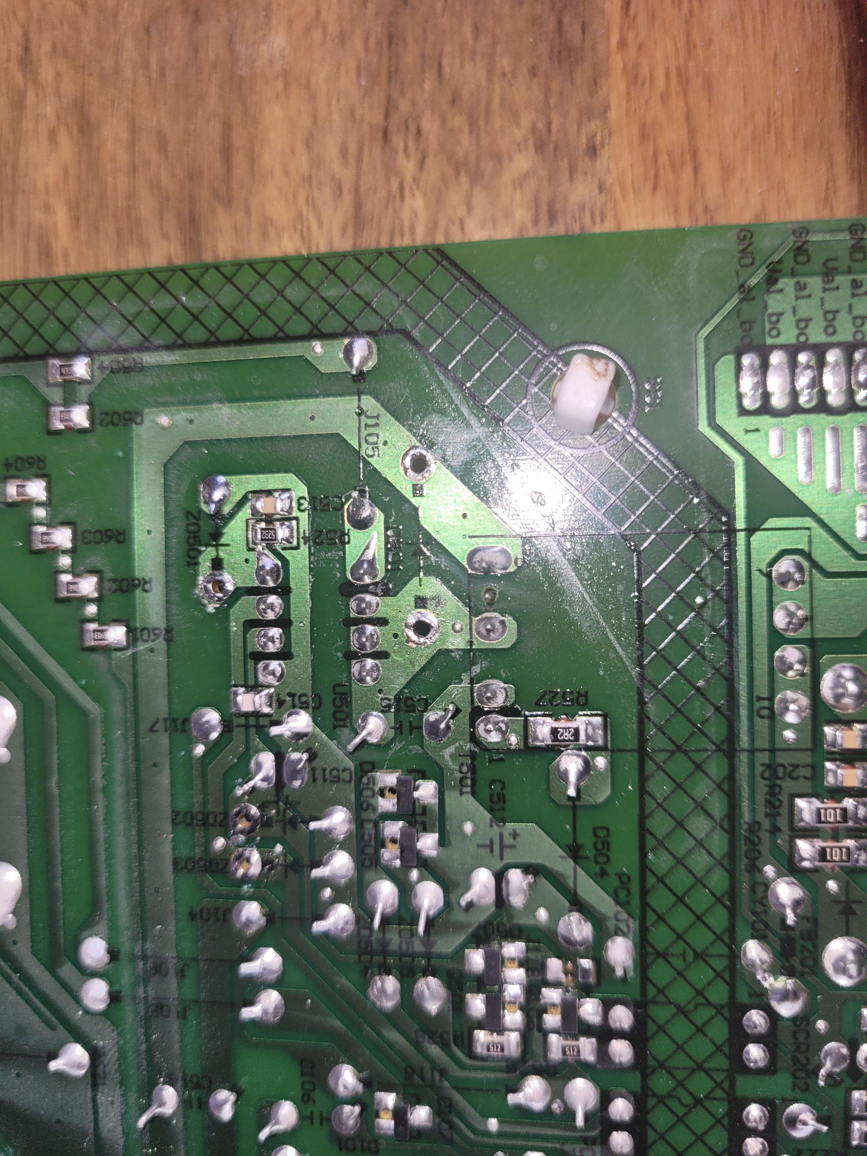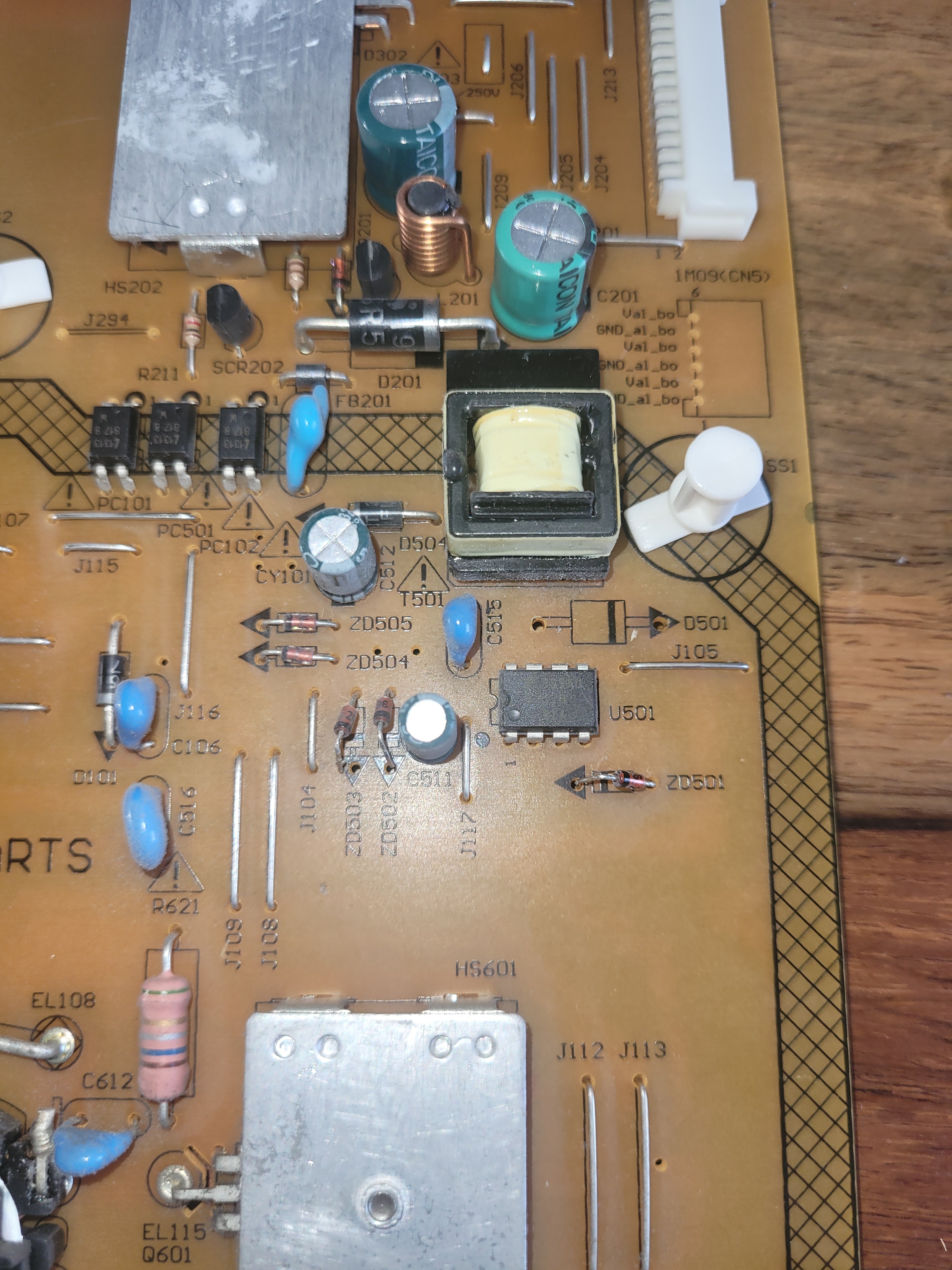 The same 32" Philips TV I was having video issues, but now I don't have standby led at all. Someone here shared with me the schematic of the power supply, and checking the voltages, I see right after the resistor R604 I'm getting 1.6 v which is too low for enabling the Gate of the Q601 mosfet (the diagram says 4.2). On the R614 resistor I'm getting 181 V in and 117 V out, then through R603 I'm getting the same 117 V in and 59.9 V out, finally getting the latter voltage in the R604 BUT getting just 1.6 V out, which is the voltage that goes on to the Gate of the Q601...