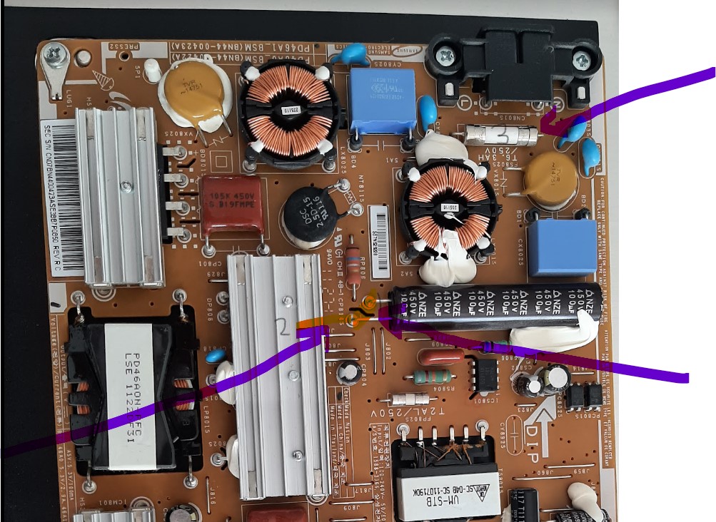 I decided to take it apart to look for swollen capacitors, too much dust, etc. I didn't find any build up of dust nor any swollen capacitors. I tried to test the large 100uf capacitor shown in the photo (1) but inadvertently shorted the 2 legs causing a large spark. TV however still powered on ok after that so no damage. With the power on (I forgot), I ended up accidentally shorting the + of the capacitor to the MOSFET heatsink (2) causing another large spark, and taking a small chunk from the heatsink. This time the TV did not power on and the 6.3A slow blow fuse (3) blew. I replaced the fuse with a 4 AMP normal fuse and was able to get the TV to power up again. I did finally correctly test the large capacitor when the fuse was blown and it showed about 91 uF.