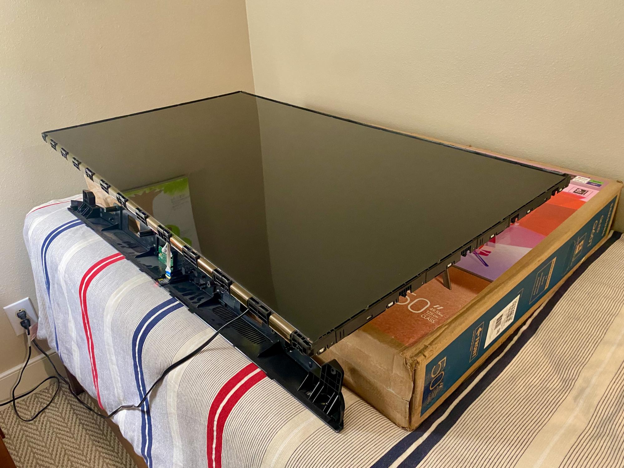 Disassembled the TV and lifted the LCD panel during testing. Band is on the LCD panel (can see the band on the panel as I lift it slightly) Backlight is perfectly even at the top edge. Double checked LCD panel alignment in the frame and is perfect but since band moved with the panel, its on the panel. Reseated both ends of the 2 T-Con flex, no change.