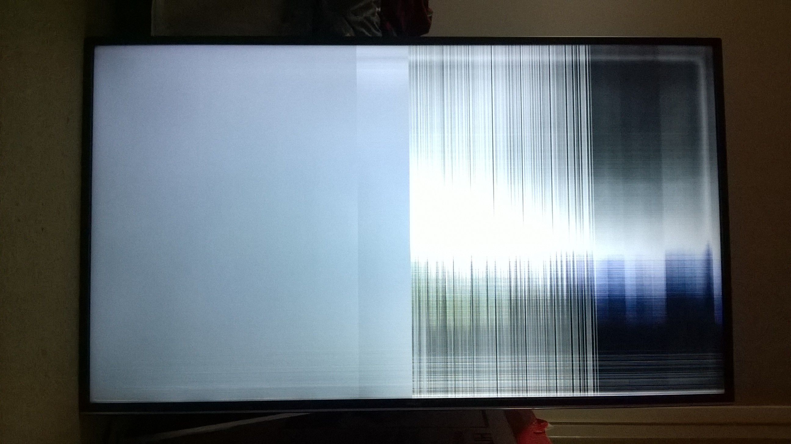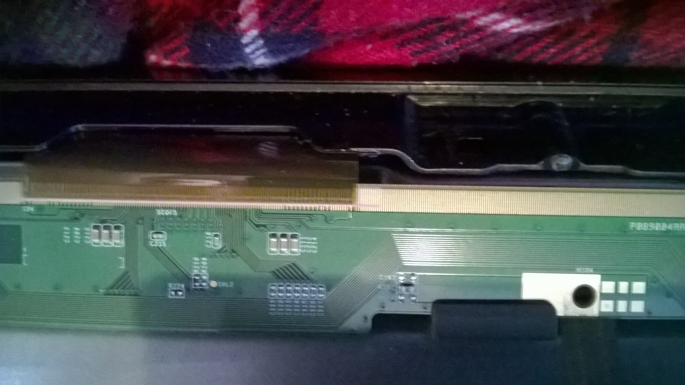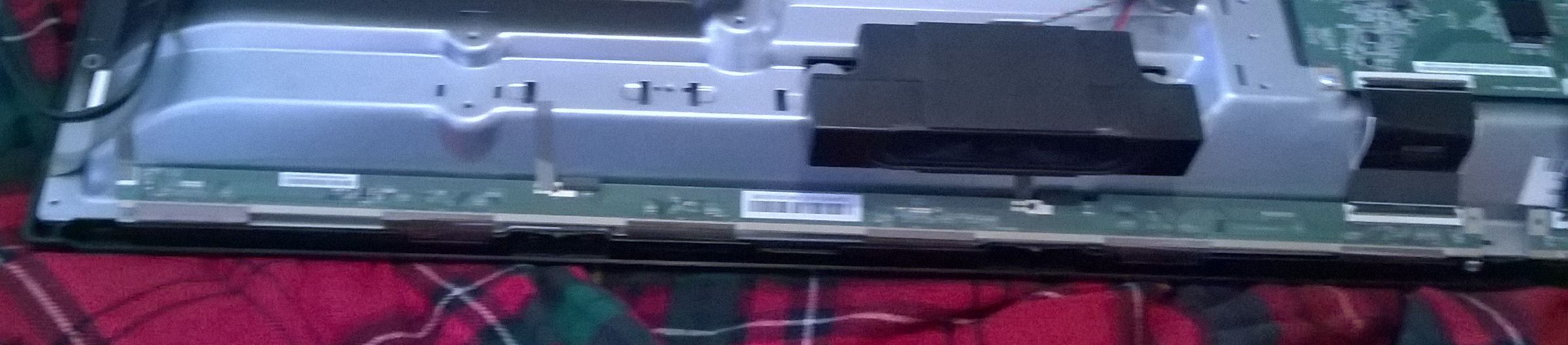 by MDY94I own a Hitachi 50HK6100U with a display fault. After some troubleshooting, I've found that removing one tcon cable produces a clear image on the side still connected. Removing the other tcon still provides display output; however, this is a heavily distorted image. With both cables connected, only the top ~25% of the screen provides display output which is still distorted. It's only when both are connected that most of the screen no longer provides output. The attached images show the screen with each tcon cable disconnected, and one with both connected. The red line shows where the display cuts...3 Photos