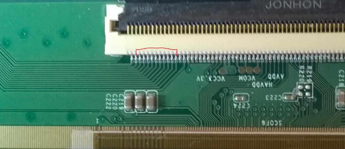 I own a Hitachi 50HK6100U with a display fault. After some troubleshooting, I've found that removing one tcon cable produces a clear image on the side still connected. Removing the other tcon still provides display output; however, this is a heavily distorted image. With both cables connected, only the top ~25% of the screen provides display output which is still distorted. It's only when both are connected that most of the screen no longer provides output. The attached images show the screen with each tcon cable disconnected, and one with both connected. The red line shows where the display cuts...