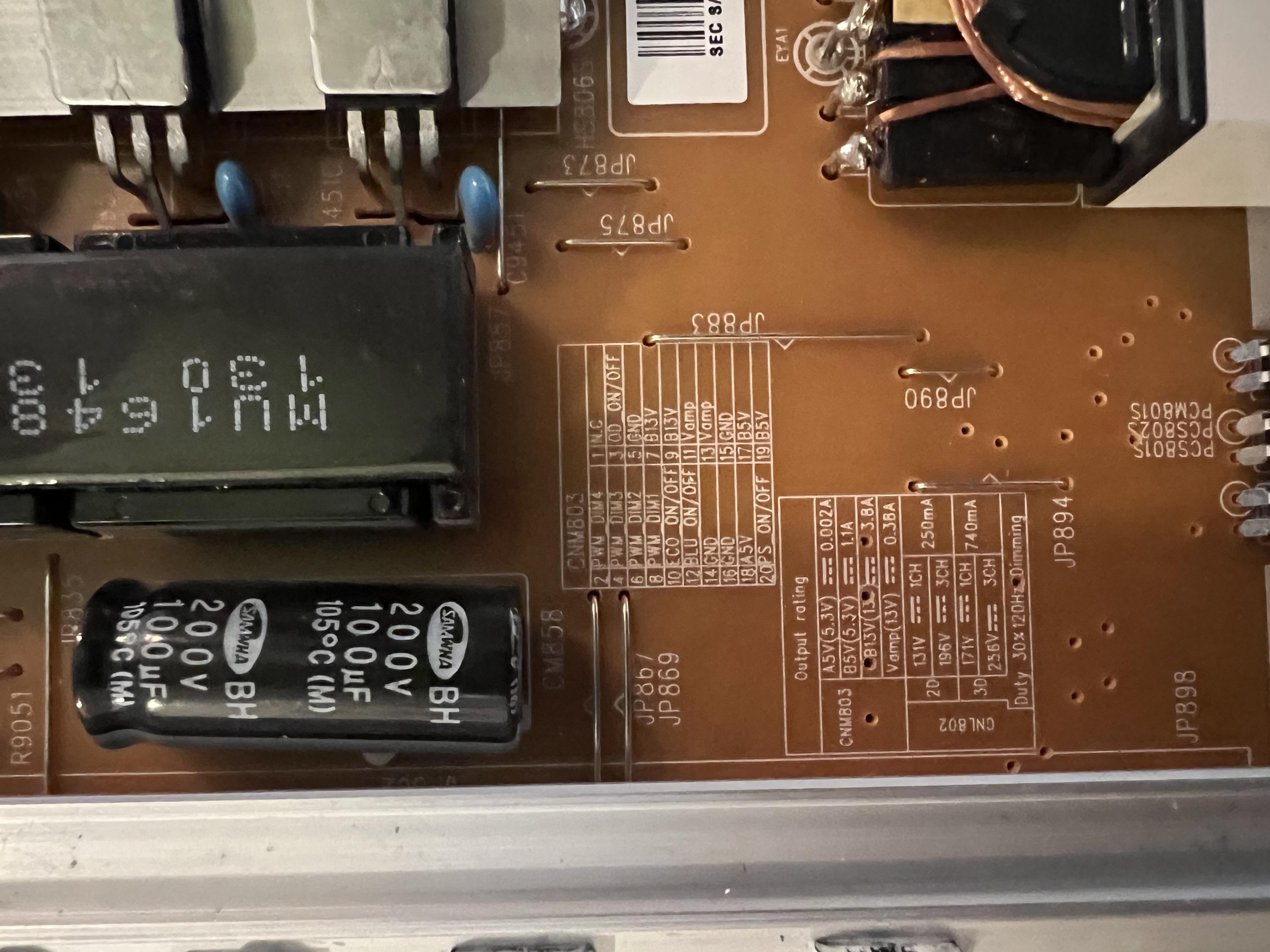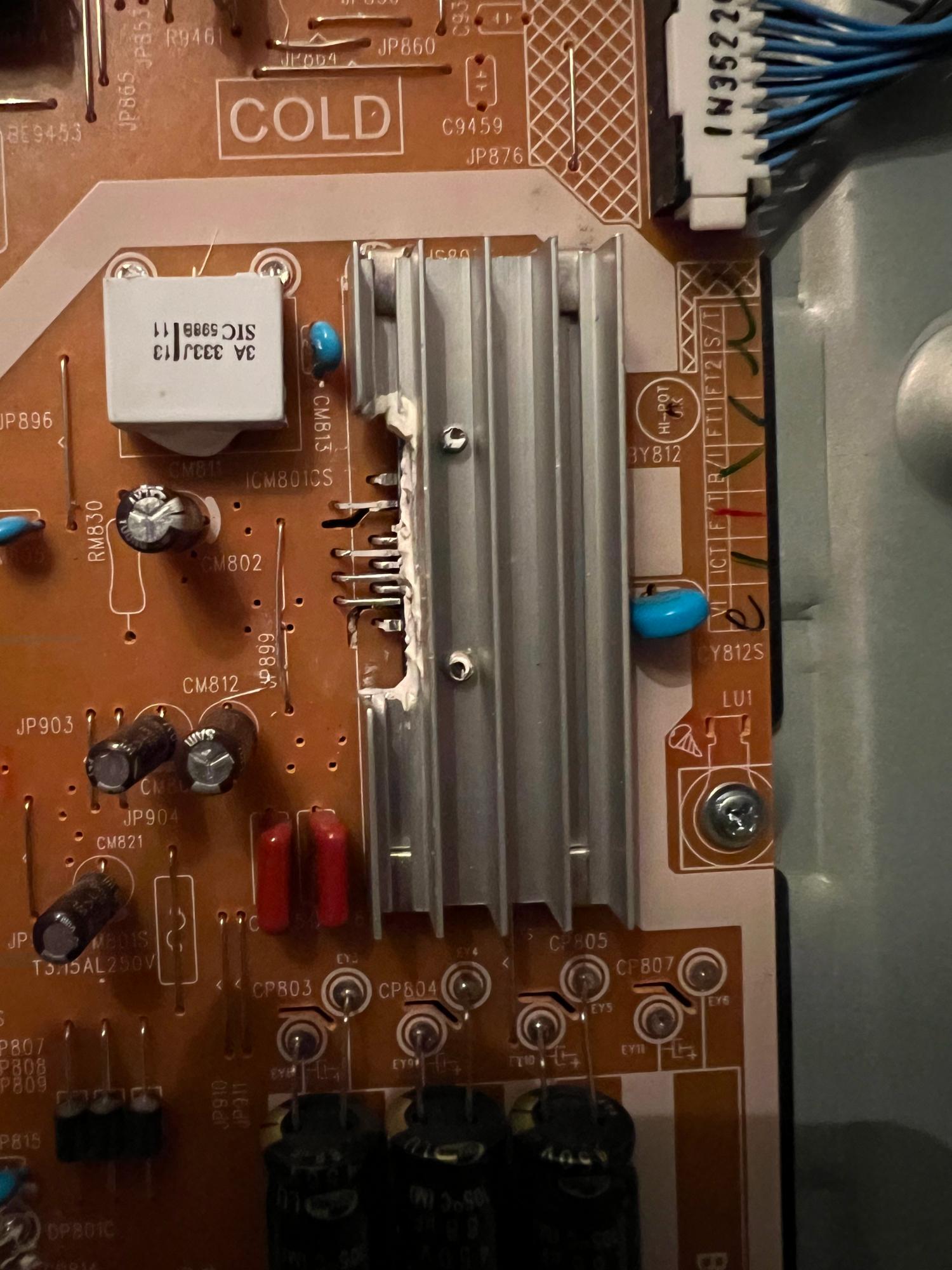 When I first examined it was completely dead. saw that the fuse was blown and the ICM801CS blown. I searched and found that the FSFR1800HSL might be the replacement and got one from ebay and replaced it. But when I pulled the ICM801CS I could see the last 3 letters on the blown up part was XSL. So may be I replaced it with the incorrect part. I fixed the fuse and turned it on and it now gives me a standby light blinking twice five times, then clicks and repeats. Checked the entire board and cant find any other visually defective parts. Pulled /20UA60DN and checked it as it's heat sink screw was stripped. It showed 0.469v when negative multimeter lead on middle pin and positive on either side pins and showed no connectivity in reverse therefore I think this one cheched out. Put board back on TV and disconnected the main board lead and turned it on and the backlight came on but when it is connected the blinking standby light happens.