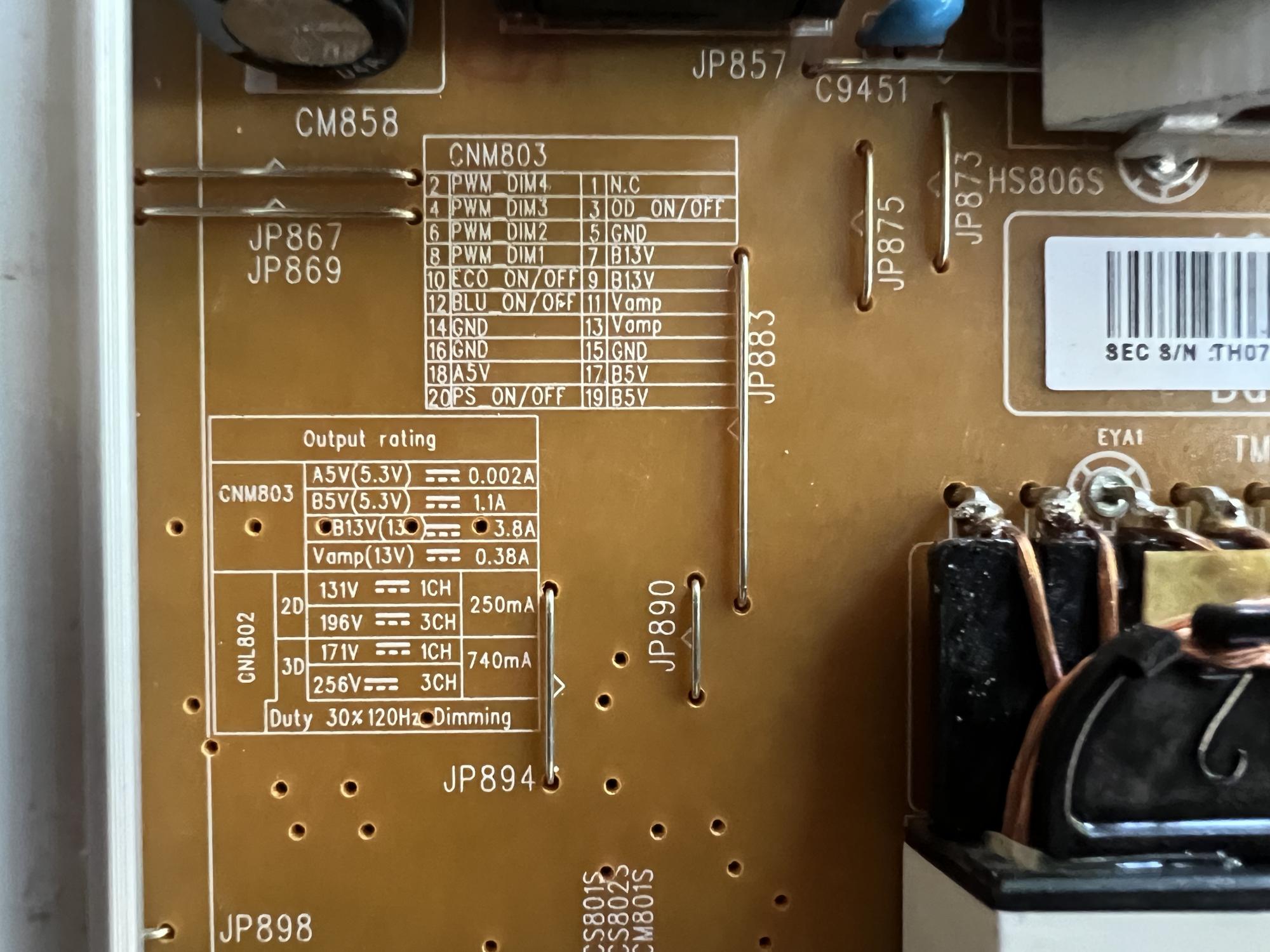 When I take out both(B13v)s (with B5v on)and try it still cycles but the BL does not flash. When I take out the (B5v)s leads(with B13 on)it goes back to doing the original standby flashing twice 5 times over and over but the BL flashes. I didn’t get to disconnecting the tcon cables one by one as that would mean that I have to take this giant tv and lay it flat. Probably do it tomorrow morning. Thank you Diah and nomoresonys.