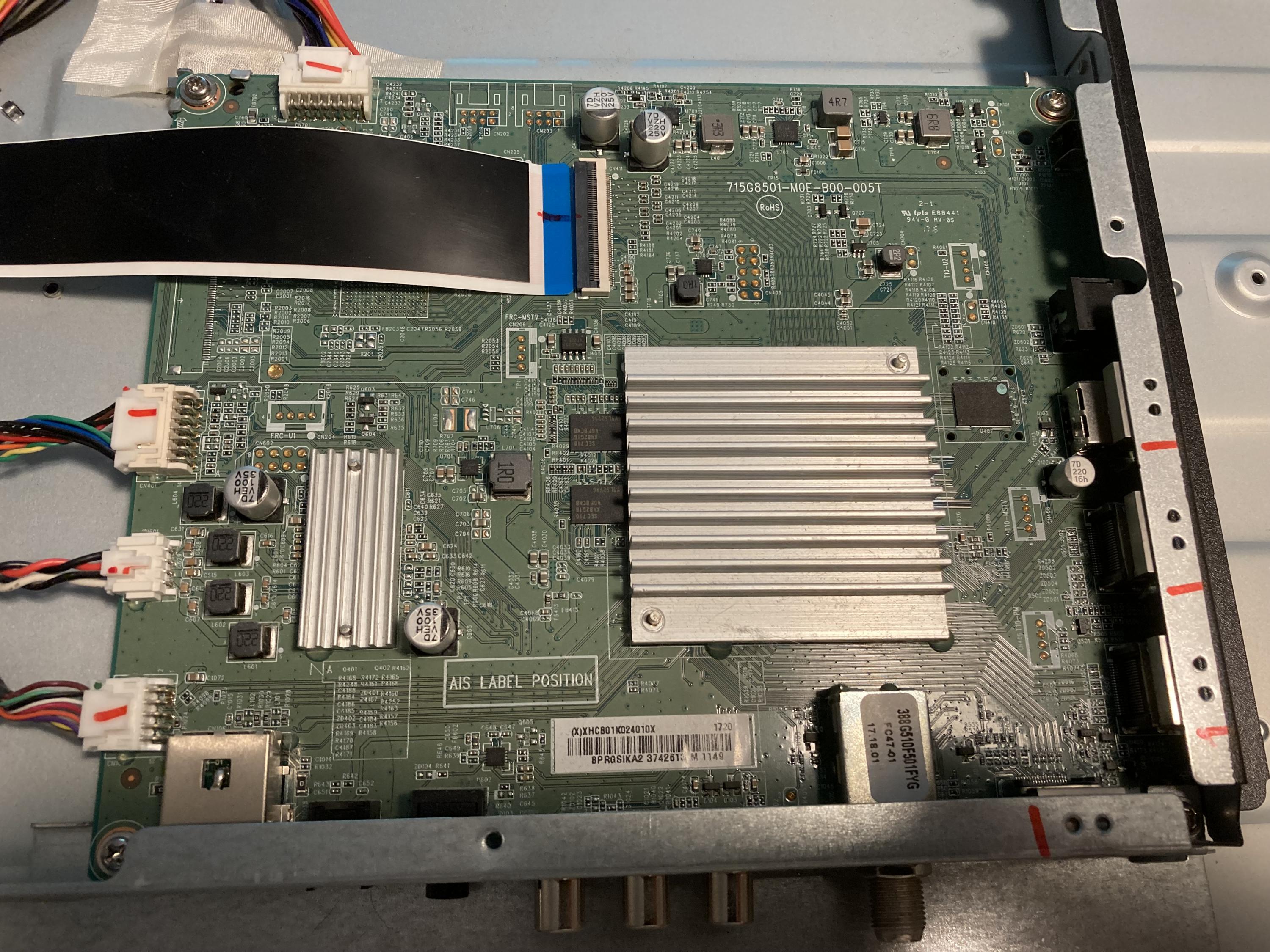 I did not notice any bulged or leaking caps on any board, the voltages produced by the power supply match the voltage that the pins are marked. The backlight leds are working. I have tried cleaning the ribbon cables on the T-CON board with isopropyl alchohol with no changes. I noticed that the mainboard seems to be working as the display changes (more red) when I push the Netflix button on the remote.