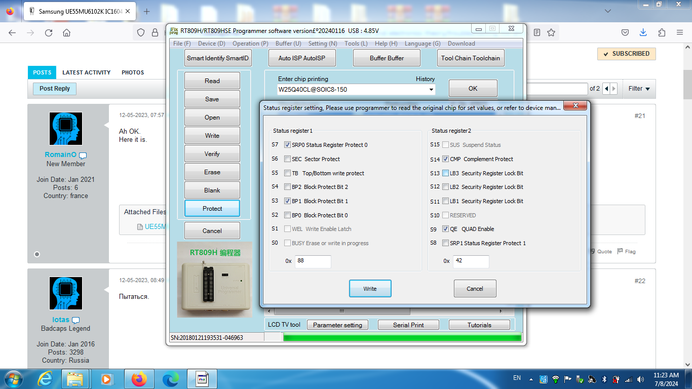 Could you help me... I have a Samsung with the following problem, dead TV, I disconnect the main power supply and the leds light up. I know it is a problem in the firmware in the IC SPI Flash W25Q40CL (IC1604)