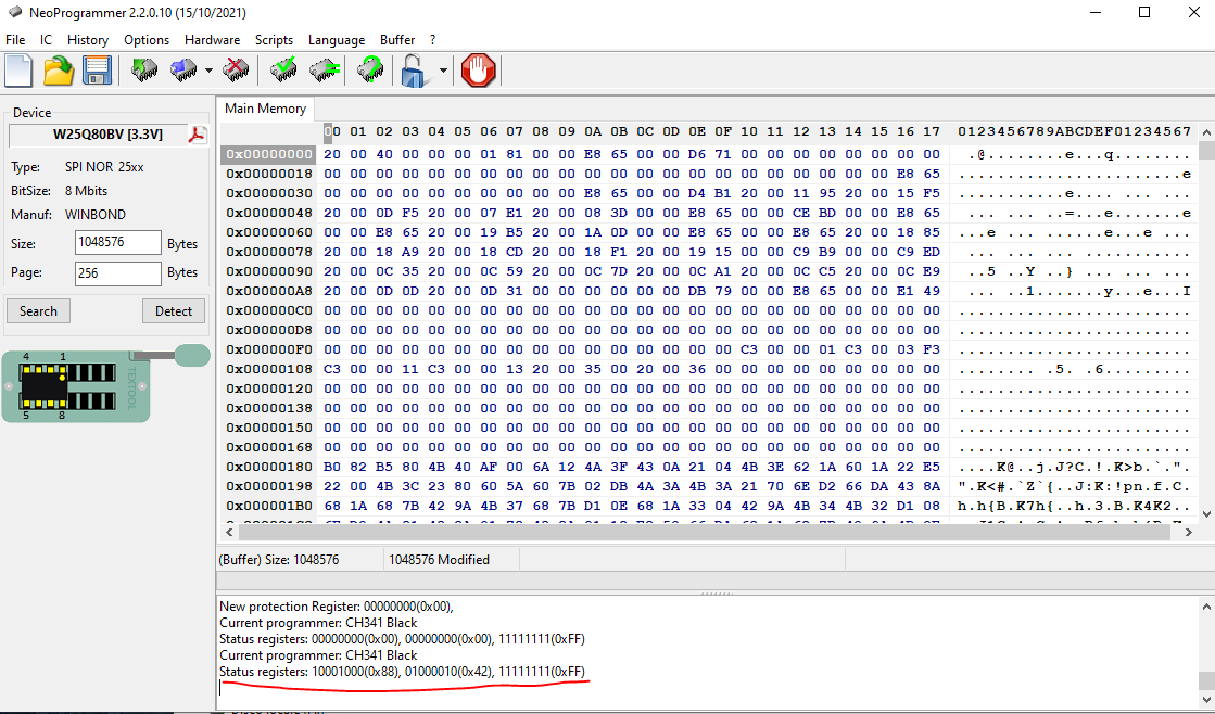 So I attached the VGA UART cable and read the debug data using a RT809H programmer: