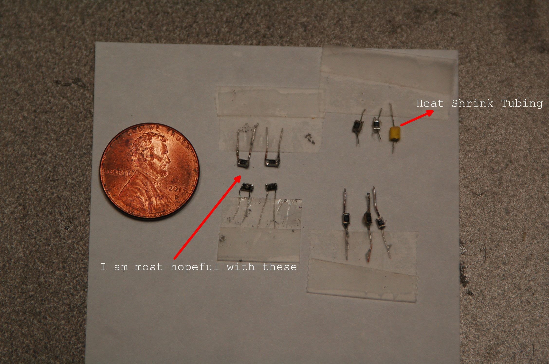 My needle nose soldering iron and the 0805 100ohm resistors finally arrived. After a lot of trial and error, 0805 resistors are still pretty small, I think I have stumbled on a way to solder a lead wire on to the ends of the resistor, scotch tape. I tape half of the resistor to a piece of paper then scotch tape the tiny wire leads down so they lay on the edged of the resistor for soldering and with a little bit of flux and a hot soldering iron I can solder the leads on the resistor. Well, it's not quite that easy but much easier than trying to hold it in place with a tooth pick. Now I have to figure out how to keep the ends in place when I solder the end to the circuit board, they're so small and short that they become un-soldered from the heat transfer up the short wire. I tried heat shrink tubing but it really isn't small enough, also thinking about glue or clear paint to keep the resistor end in place when I solder the other end to the circuit board. I have done some end to end like most resistors but they are so “big” that there isn't much room for the wire and I know they will melt both sides of the wire and fall off. So I am going to try edge soldering in hopes of being able to get the resistor further away from the soldering point. (see pictures). I might try gluing the resistors in place in hopes that the glue will keep the wires connected at the resistor when I solder them in circuit. I will keep you updated when (if) I successfully solder the resistors in place. Have a great 4th of July. Regards, Gil