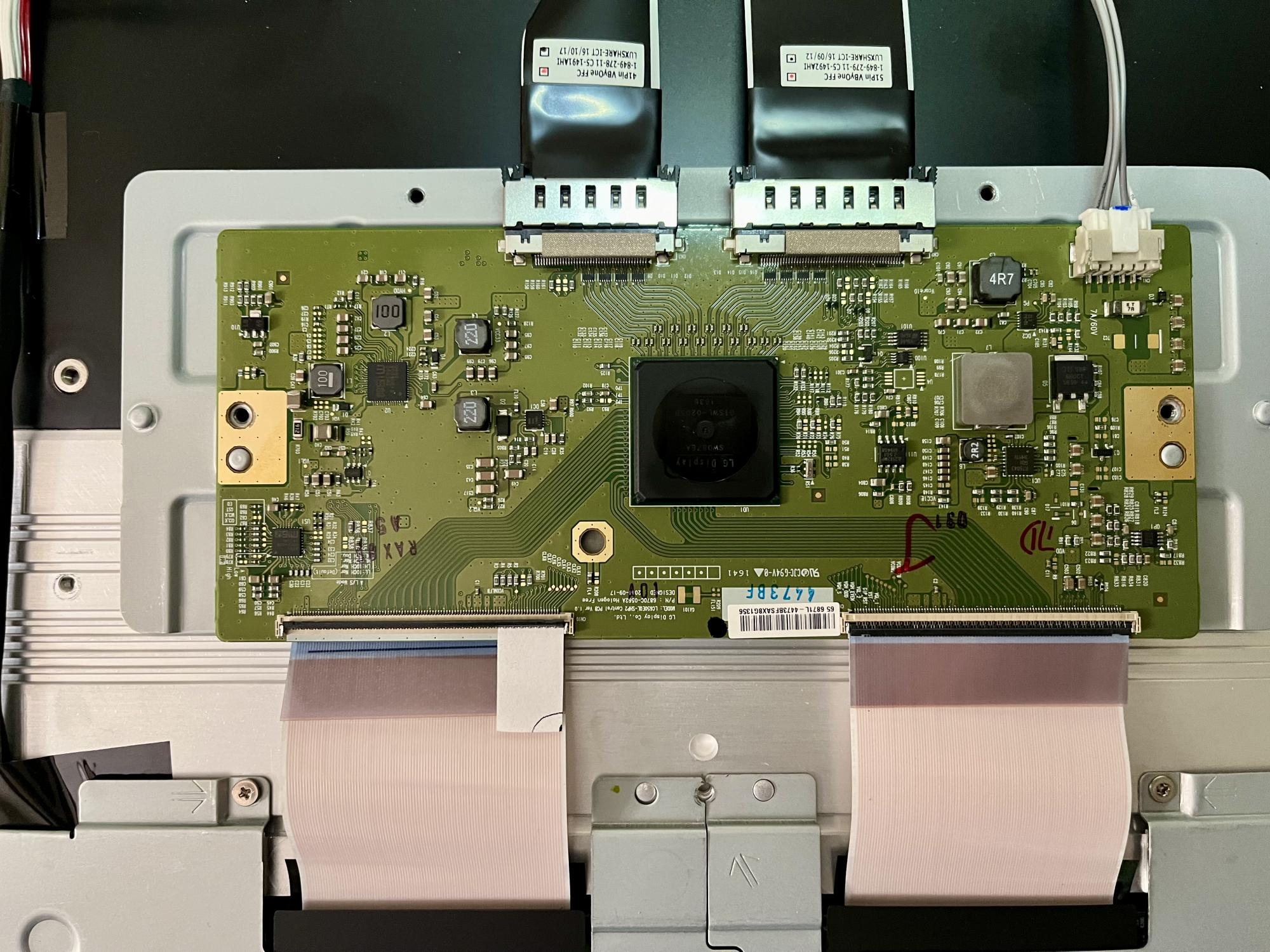 After bringing it home and plugging it in, the TV turned on with its backlight working but had no picture. After removing the back cover, the first thing I tried is to unplug one of the ribbon cables and the situation is as follows.