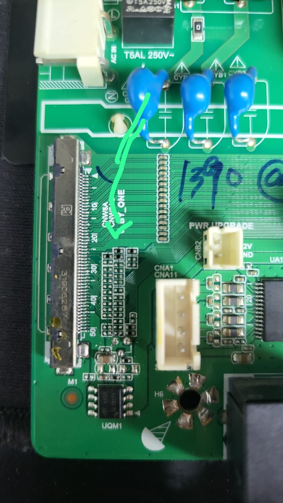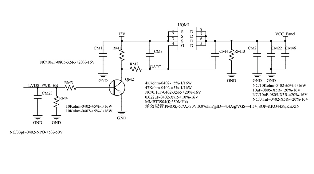 If I disconnect a flex from the panel, there are no reference voltages in the tcon either. The 12v do not appear in the flex of the mainboard, neither in the end of the main nor in the end of the tcon. there is an integrated in the main that corresponds to a mosfet (uqm1). in the base and the source there is 12v. in the drain there is 2v if we do not connect the tcon, and 0v if we connect the tcon.