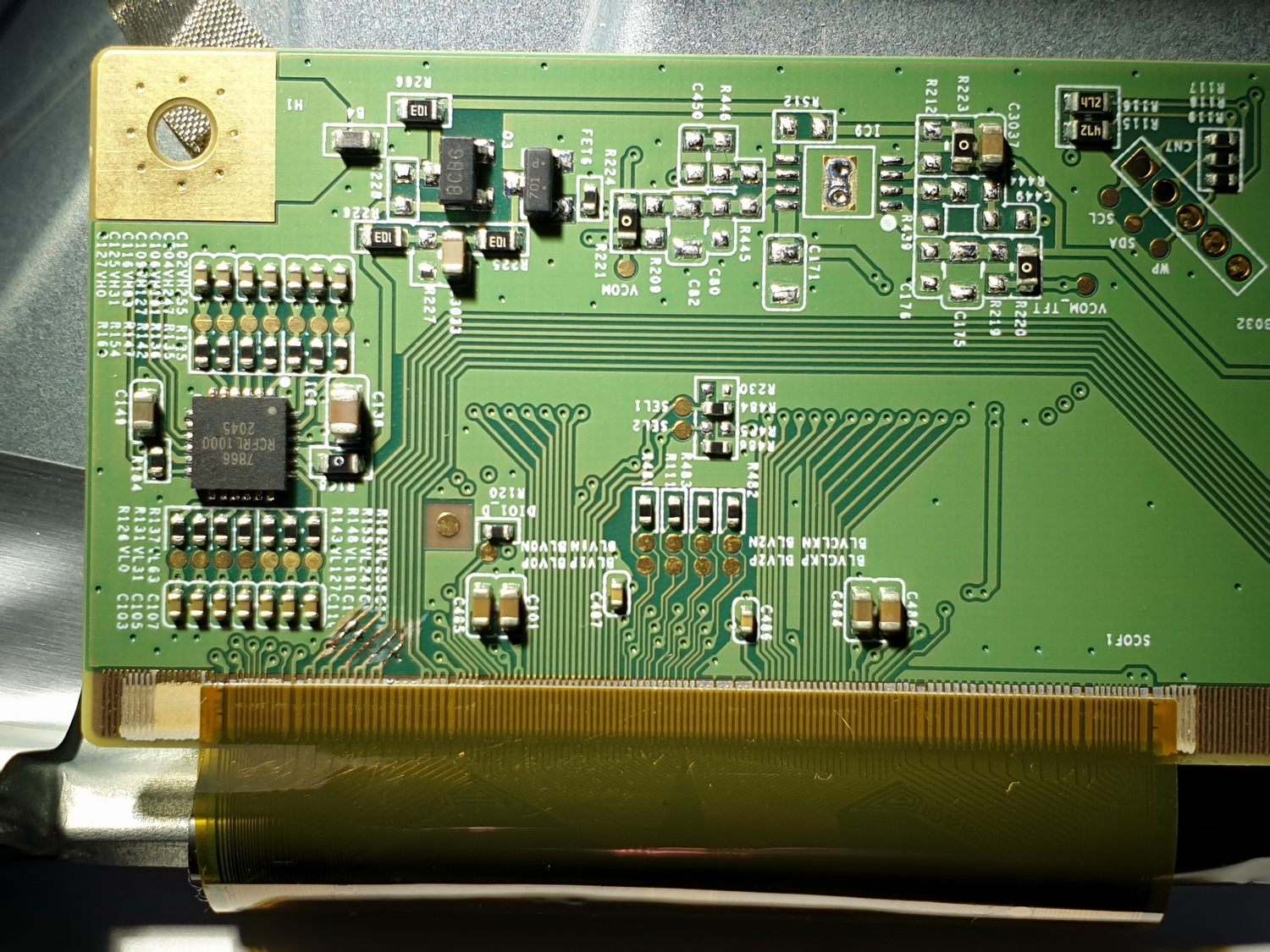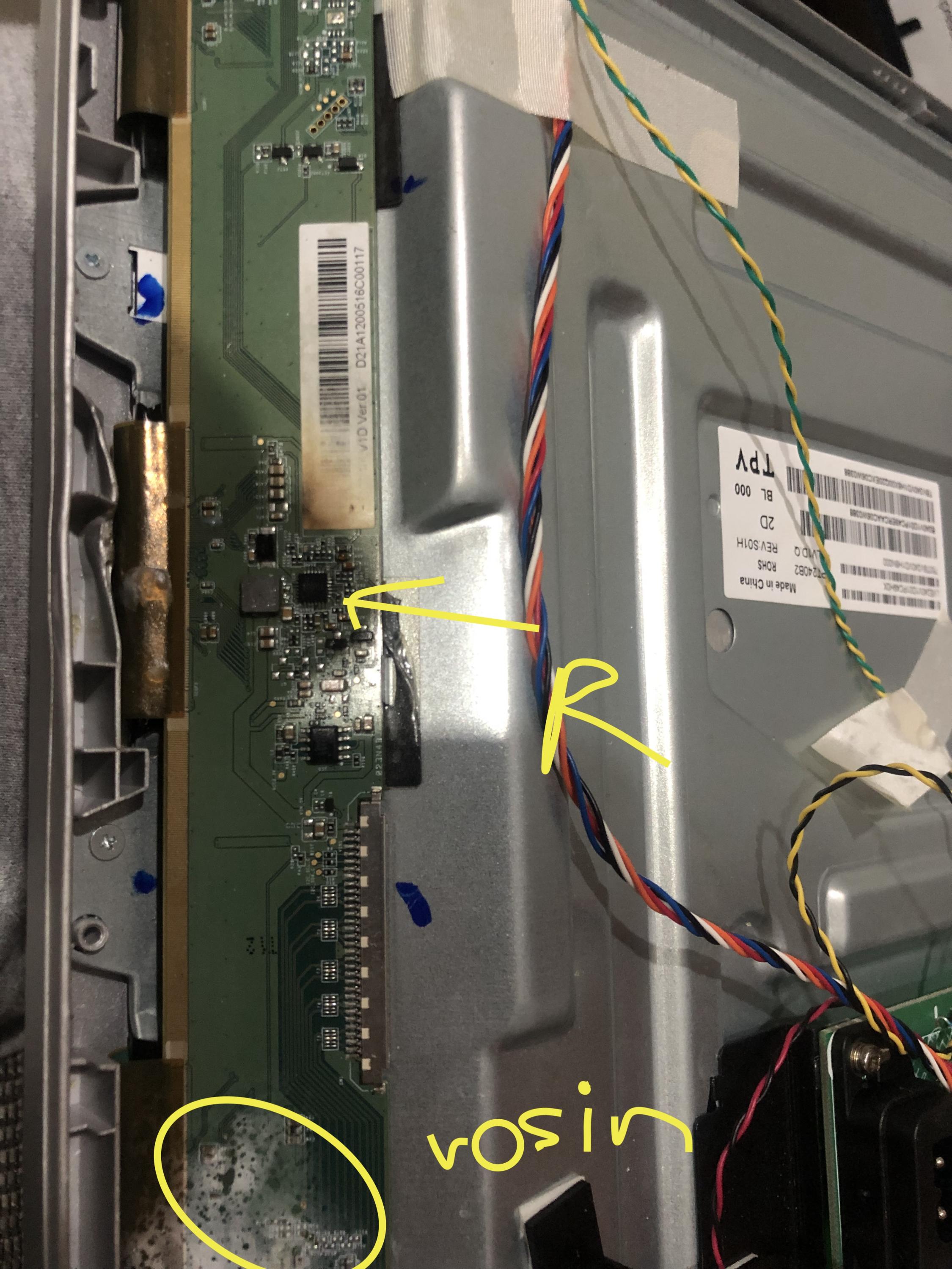 hi, im working on a Philips tv that works good, mainboard good, backlight good but the side board that control the lcd panel don't work good, in first time it only worked when I touched the board in a specific point that was very hot, I think it was a short-circuit and when I touched it my hand worked like dissipator, I had found that the source was a resistance so when I eliminate it there wasn't a short-circuit anymore but still without image only color lines when I touch the new resistance wit a metalic thing and it sparks, where can be the problem? lasts image are a close up of the board(ins't the one that is broken, that's first photo)