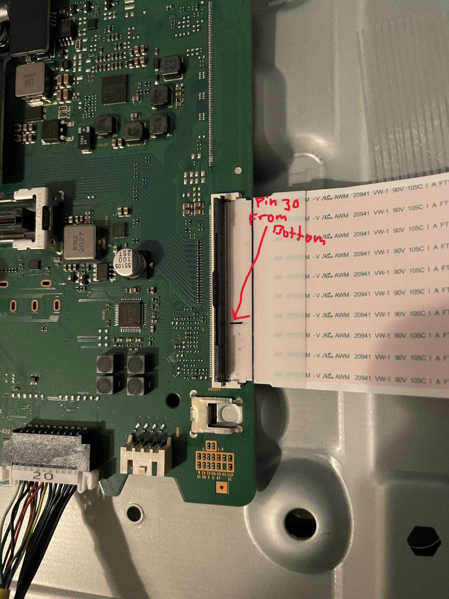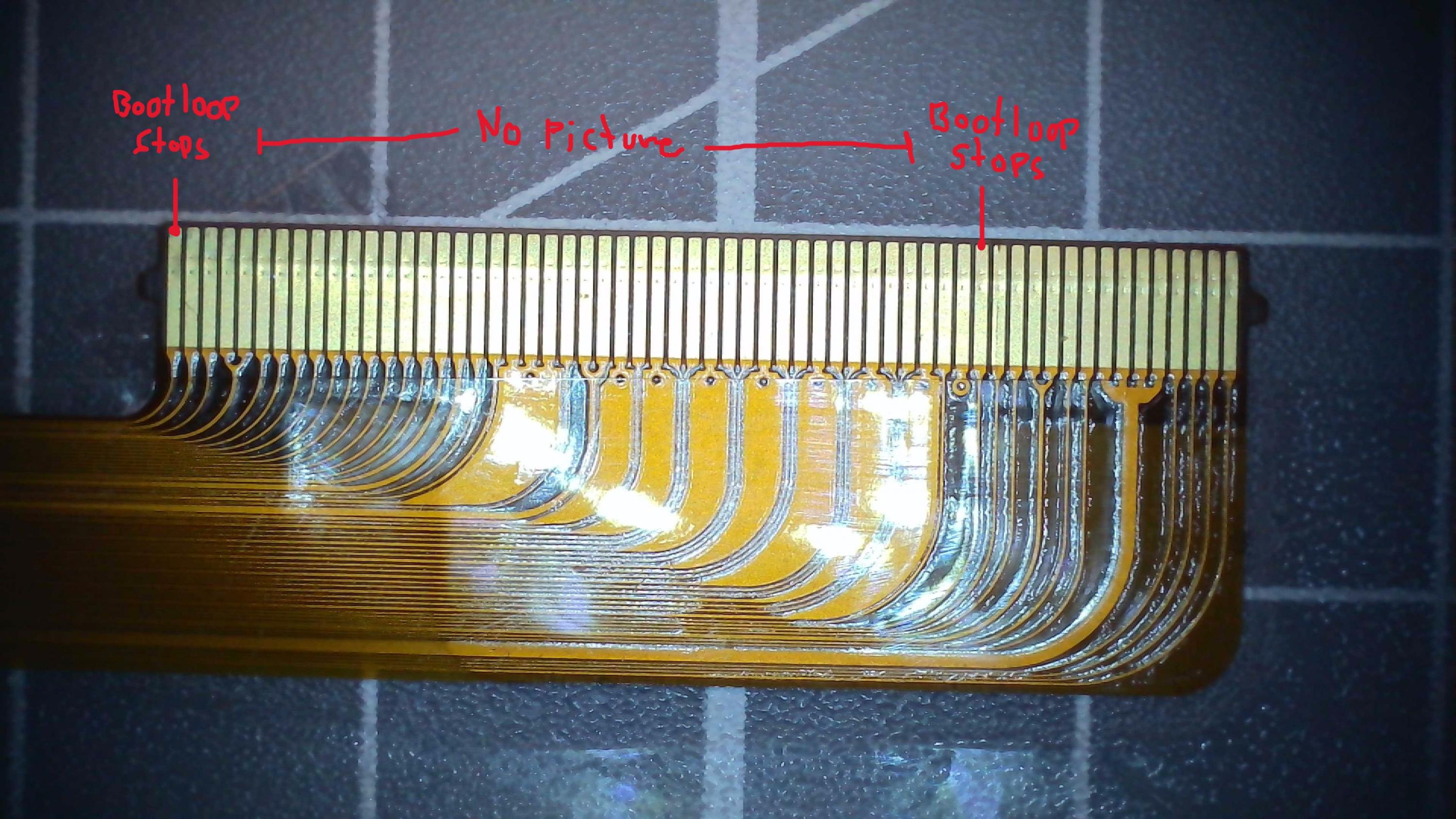 For some reason the tv started to not show a picture at all. It simply started the bootloop right away. Even with the before-mentioned pins taped off. I managed to stop the loop again by taping of a pin on the ribbon cable going into the main board. Pin 30 from the bottom. Any ideas? Or is it even fixable?