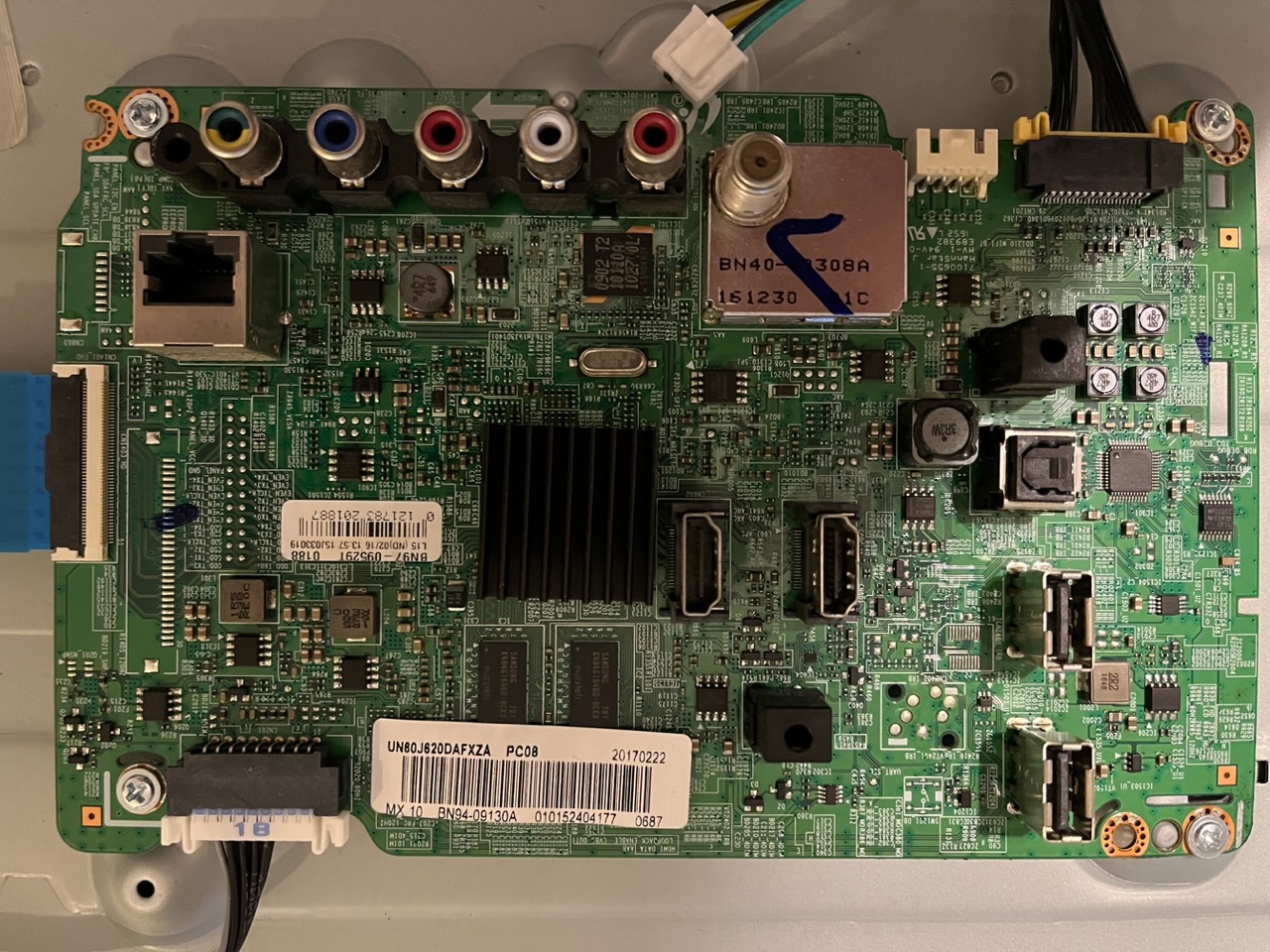 Saved this TV from the trash but it will not power on the red power indicator light blinks 6 times with no display. I've attached pics of the power board(1st pic) and mainboard(2nd pic). I don't see any blown caps on pb like I expected so what do y'all think is the issue?