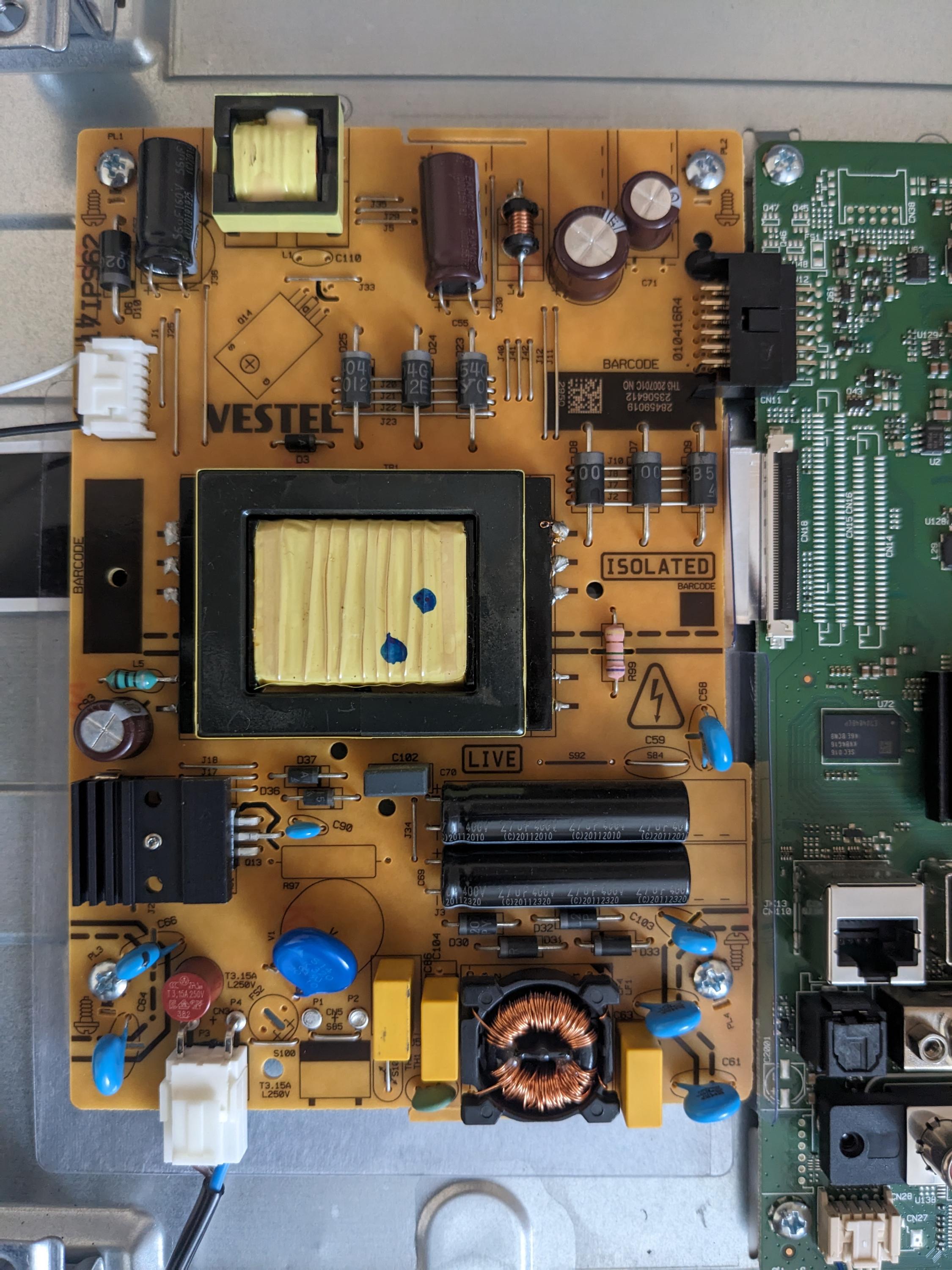I came across this forum because I need some advice about my Telefunken XF43G511 TV. It is originally a Vestel device. For some time now I have had the problem that the TV gets a black screen when the electronics are heated up. The backlight is still there and the sound still works. It's just the screen itself that goes off. When I switch off the TV and it cools down, the TV works again after a while. Could you please give me some advice on what could be causing this problem? I have also attached some photos of the electronics.