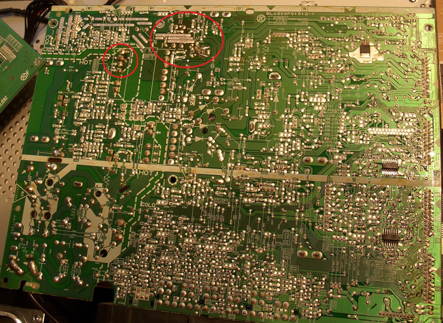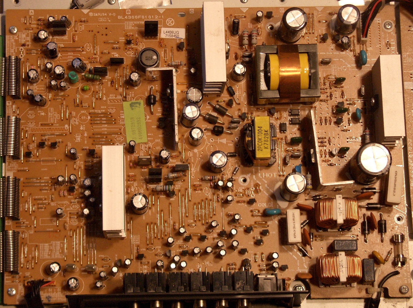 I'm attempting my first LCD TV repair, an Emerson LC320EM8 that I bought at a garage sale yesterday. I downloaded the manual from Funai but don't see any information on power LED error codes. The power LED immediately is red upon applying AC. When attempting to power on, there are two green blinks then it returns to solid red. Any error code information or if you see anything suspicious in the pictures, I'd appreciate any feedback. I searched on Emerson and Funai in the forums to see if there's much info. and didn't find any related threads.