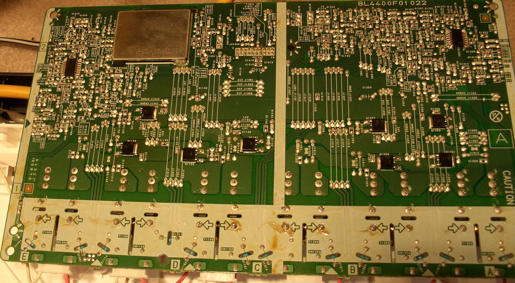 I don't see any bulging capacitors (mostly Nichicon), nor any burnt or damaged resistors/diodes/ceramic caps/semiconductors. There is some flux residue on the bottom side in a few spots, but again, nothing that catches my eye as a potential problem.