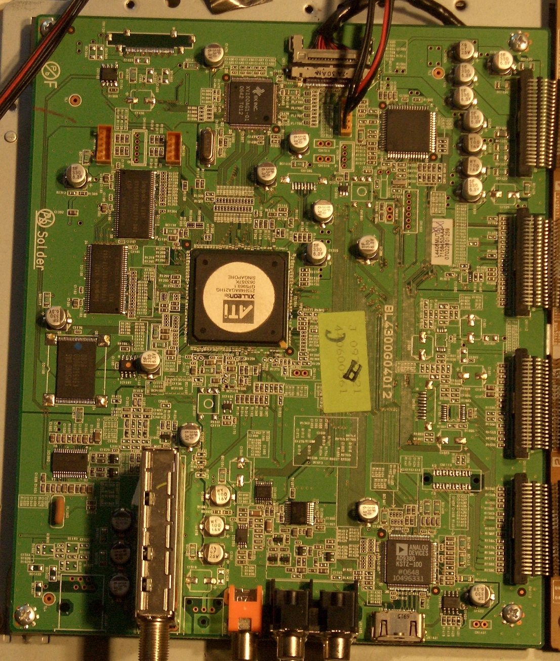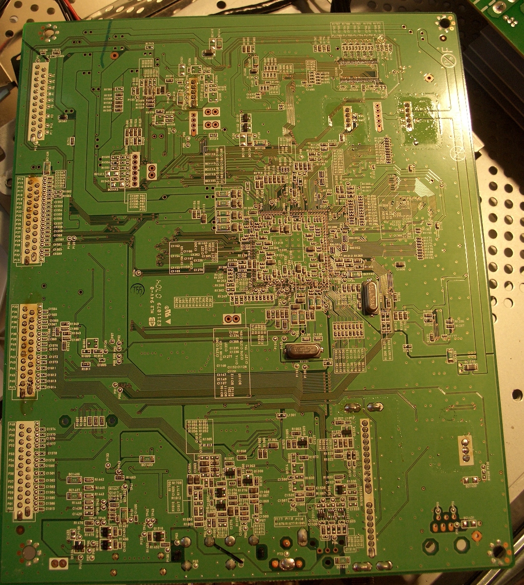 <Rant mode ON> I suggest you ignore the TV for a few minutes and concentrate on the pictures you have provided. Frankly, they provide very little information to anyone trying to help you. The TV seems to have three boards; only one is shown. The one board appears to contain the power supply and inputs, but no signal processing components. The resolution is so poor and the glare so bad that tracing anything is impossible. <Rant mode OFF>