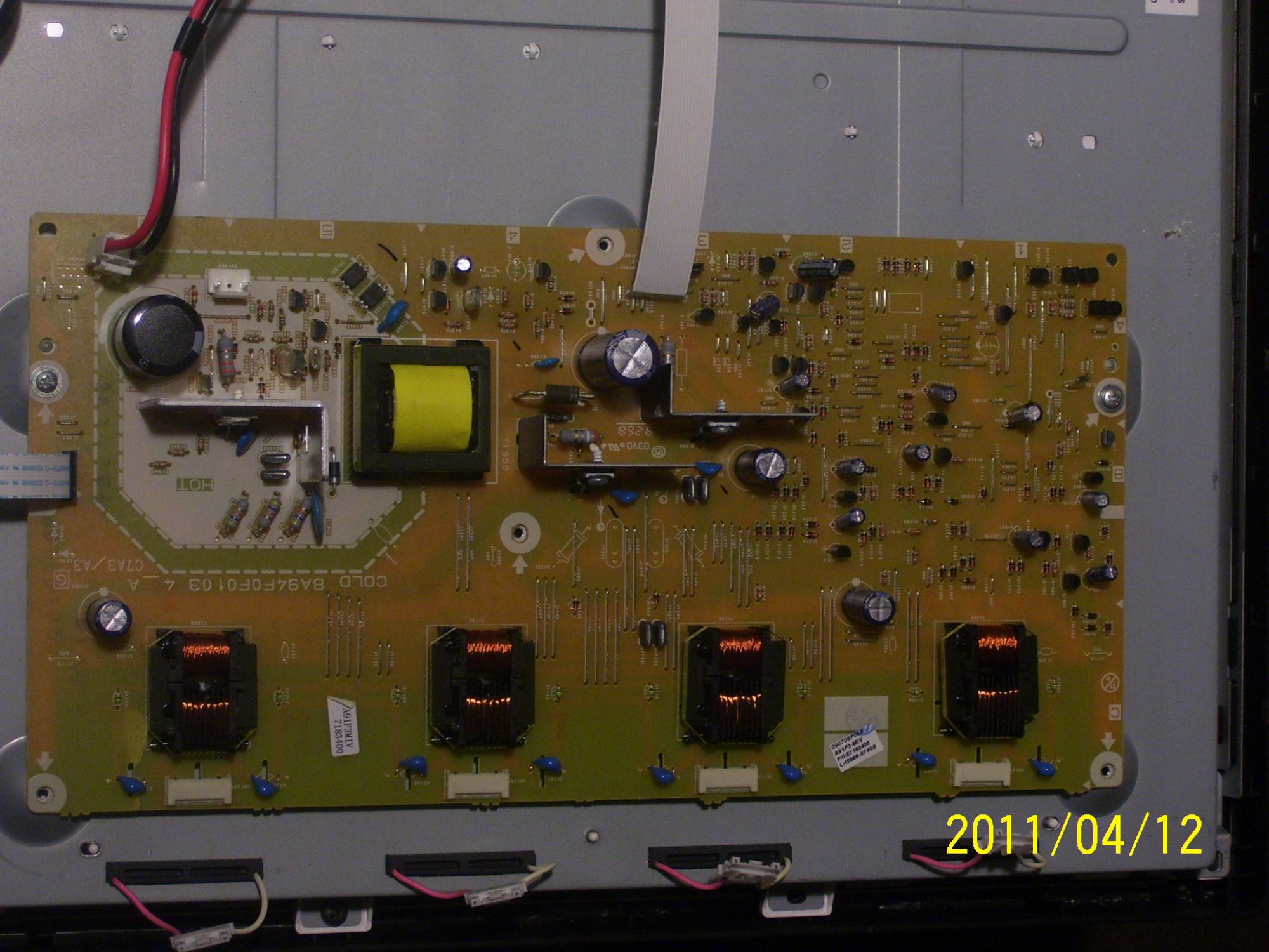 I appreciate the pictures. This is an unusual design; I don't think I've ever seen anything like it. What I find most remarkable is the 'inverter' seems to be unusually complicated. Of course, it's got it's own power supply. But where is that ribbon cable at the bottom of the inverter going?This tv shutsdown to standby so fast the B/L wont flash nothing. I'm not familiar with this chassis. I checked mosfets on inverter and the 4 xformers are ok on the secondary. If I pull all the wires off the inverter and power up it stays green. IDK, I think I attached pics will see if they show up... Referring to pulling the wires I mean the ribbon going from main to inverter.