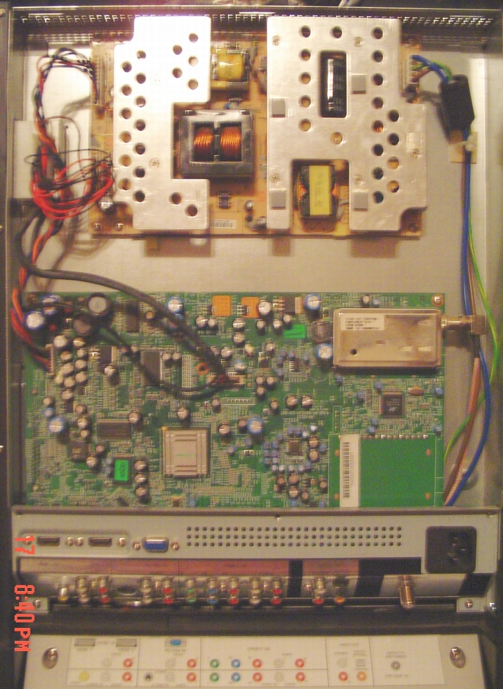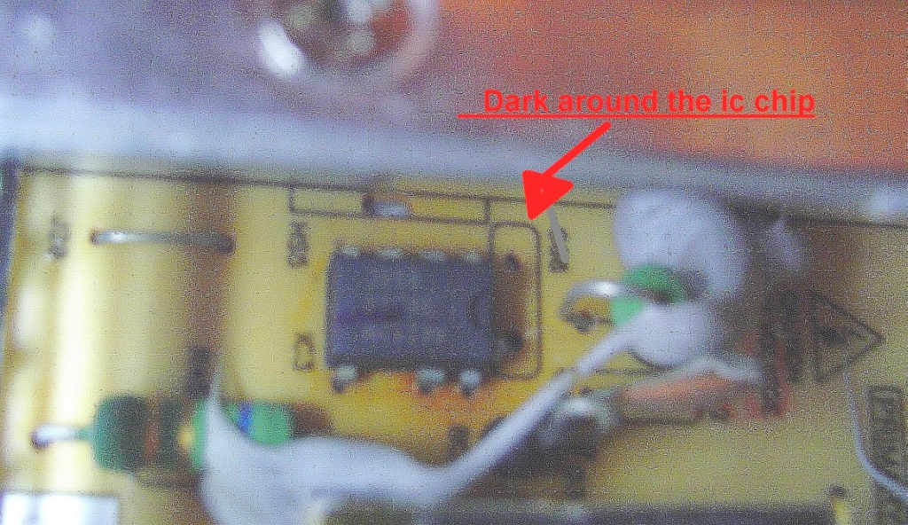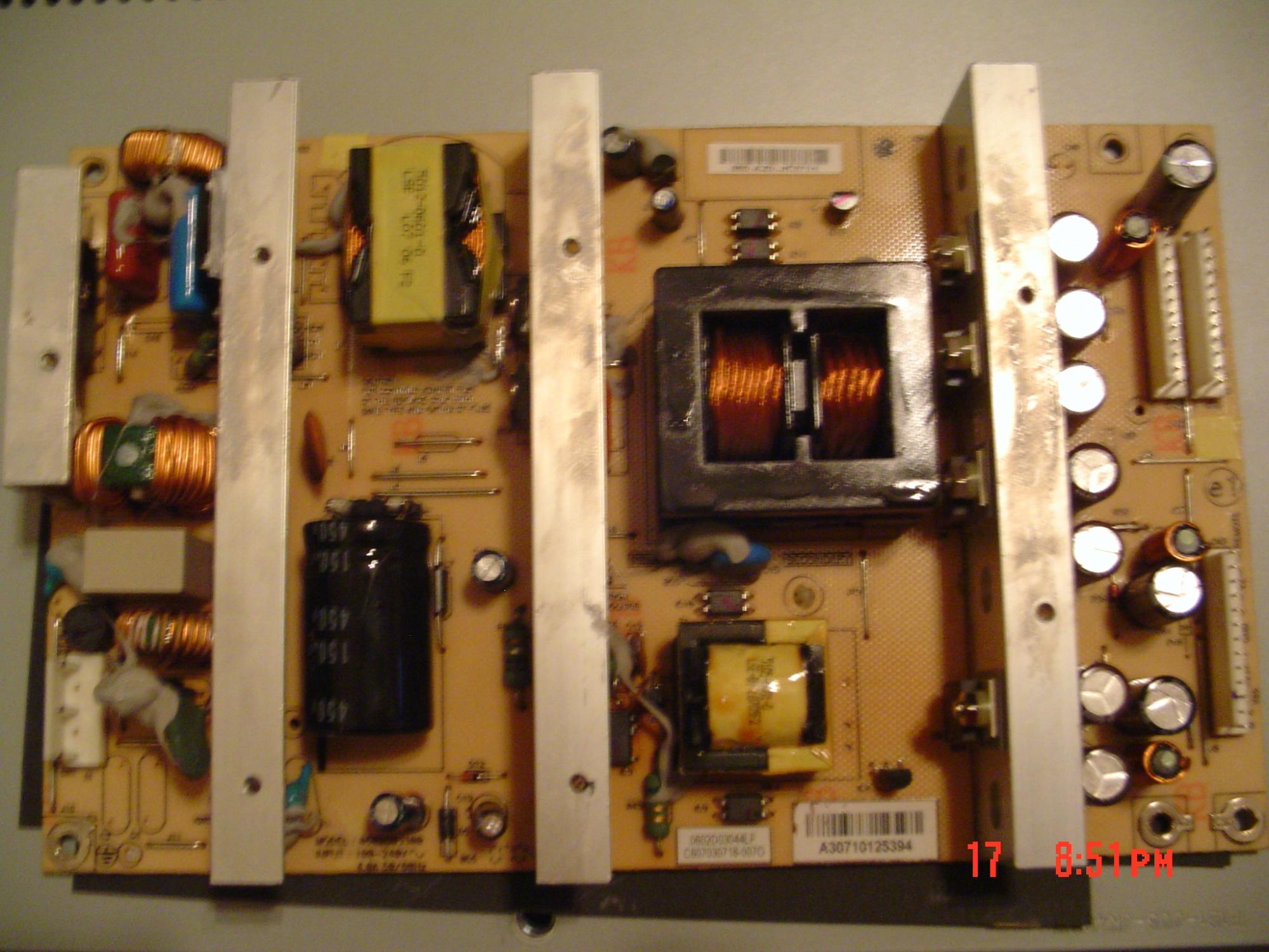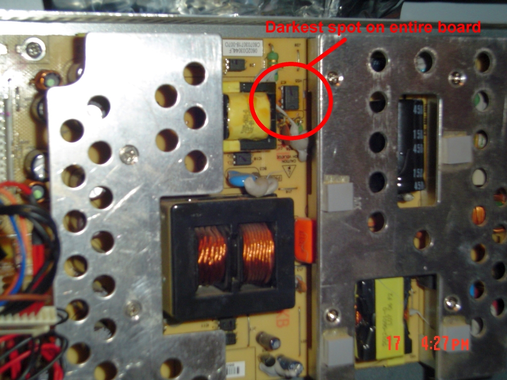 I am mechanically enclined and familiar with using and reading a multimeter. ive taken the back cover off of the tv and thoroughly inspected the main board and power board looking for bad caps or something burnt. all the caps LOOK good, none bulging or exploded on either main or power board. However, there is one concern i have and its on the power board. to me it looks like something may have burnt, but i dont see any secondary indicators on any of the components near it. Attached are 2 pictures of what im talking about.