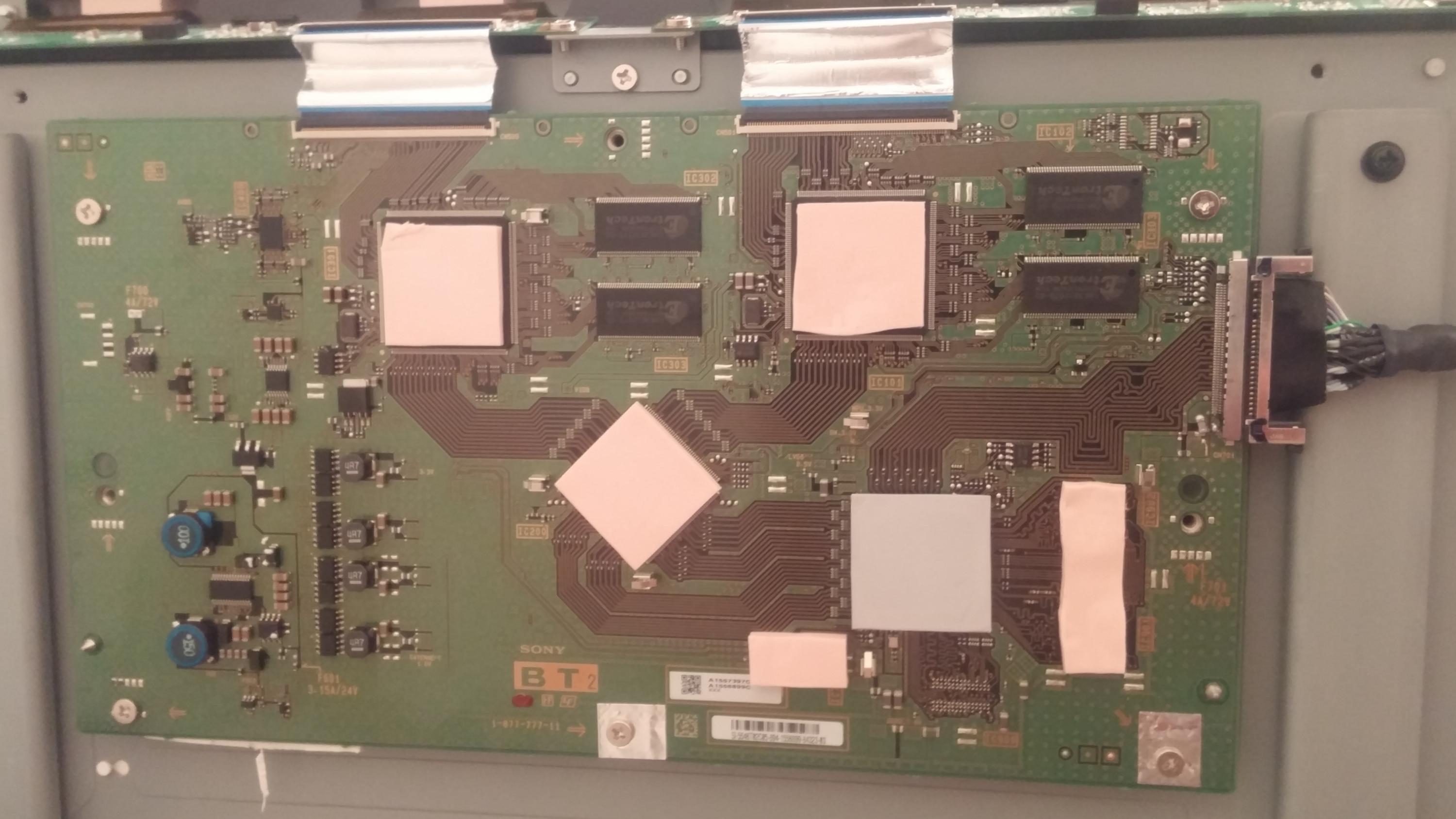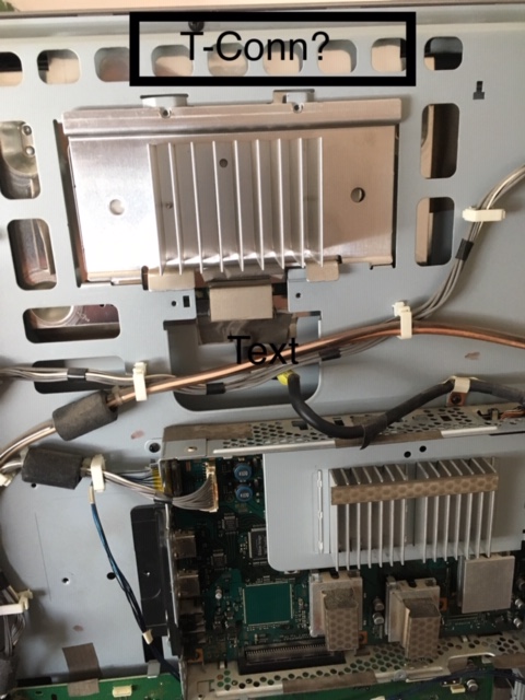 Sony kdl-46xbr2...Looking for t-conn board and how to get access to it. Service manual lists no board by that name .Just letters and numbers.Attaching pic. If what I have labelled is T-conn board ?? How to get out. looks like heat sink is screwed in from back side or does heat sink just pull off?? or split the chassis to get to .. Tv has no picture no sound no backlights. swapped out both the main and power boards..no change.. Green power light is on as well as amber lights on be2 board..