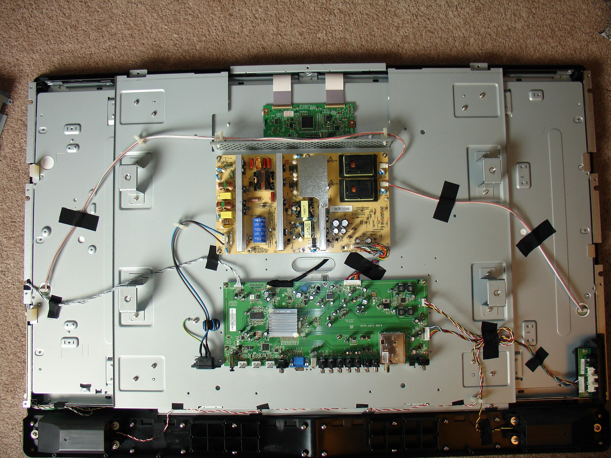Observations when I opened it up: I saw no bad capacitors or any visual signs of blown fuses. (FYI-I do not own voltage/wattage testing equipment). I proceeded to plug in power. The T-conn board had a blue LED light that came on along with the backlight when I first turned the TV on. Several seconds after the white backlight came on, the blue LED light faded out to black. I became aware of a very faint hum after about a 30sec. - I believe it's coming from the power board, didn't wanna get my ear too close while the power was on.