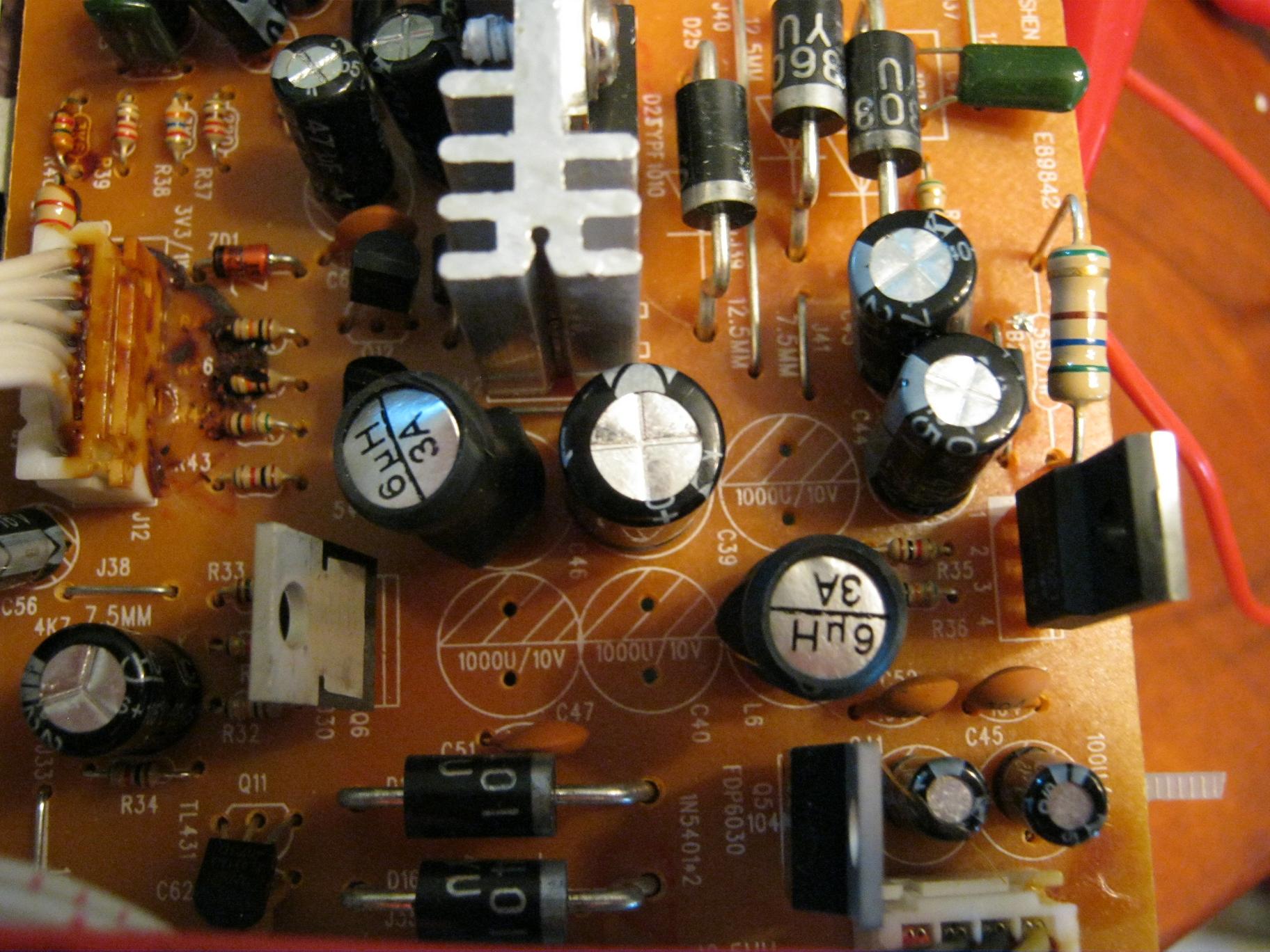 The four big caps on the output are all KSD 1000uF 16V. Strangely, none of the caps on the power board are rated for less than 16V. I don't know if those are low ESR caps, but I have tons of caps that might work: