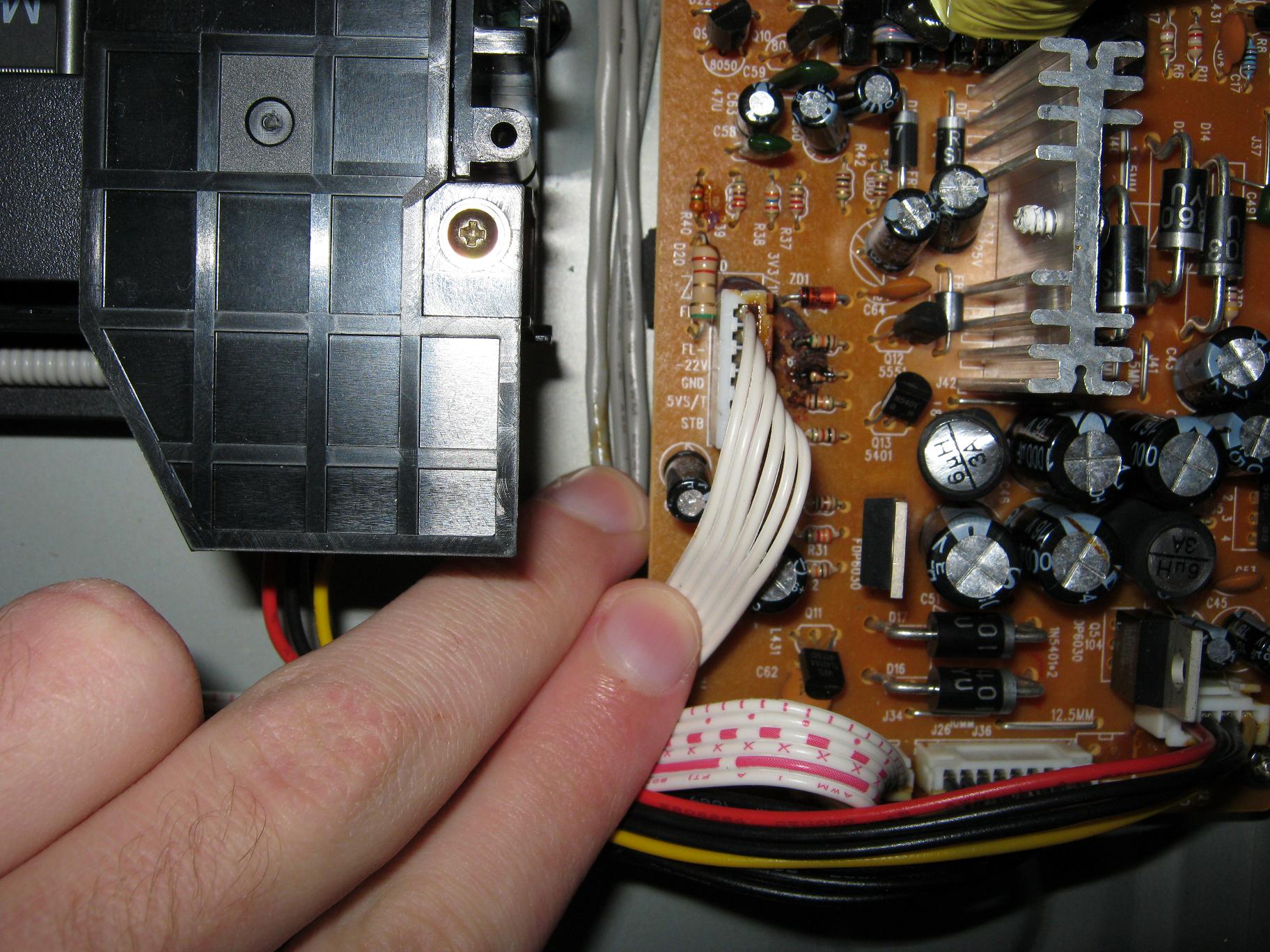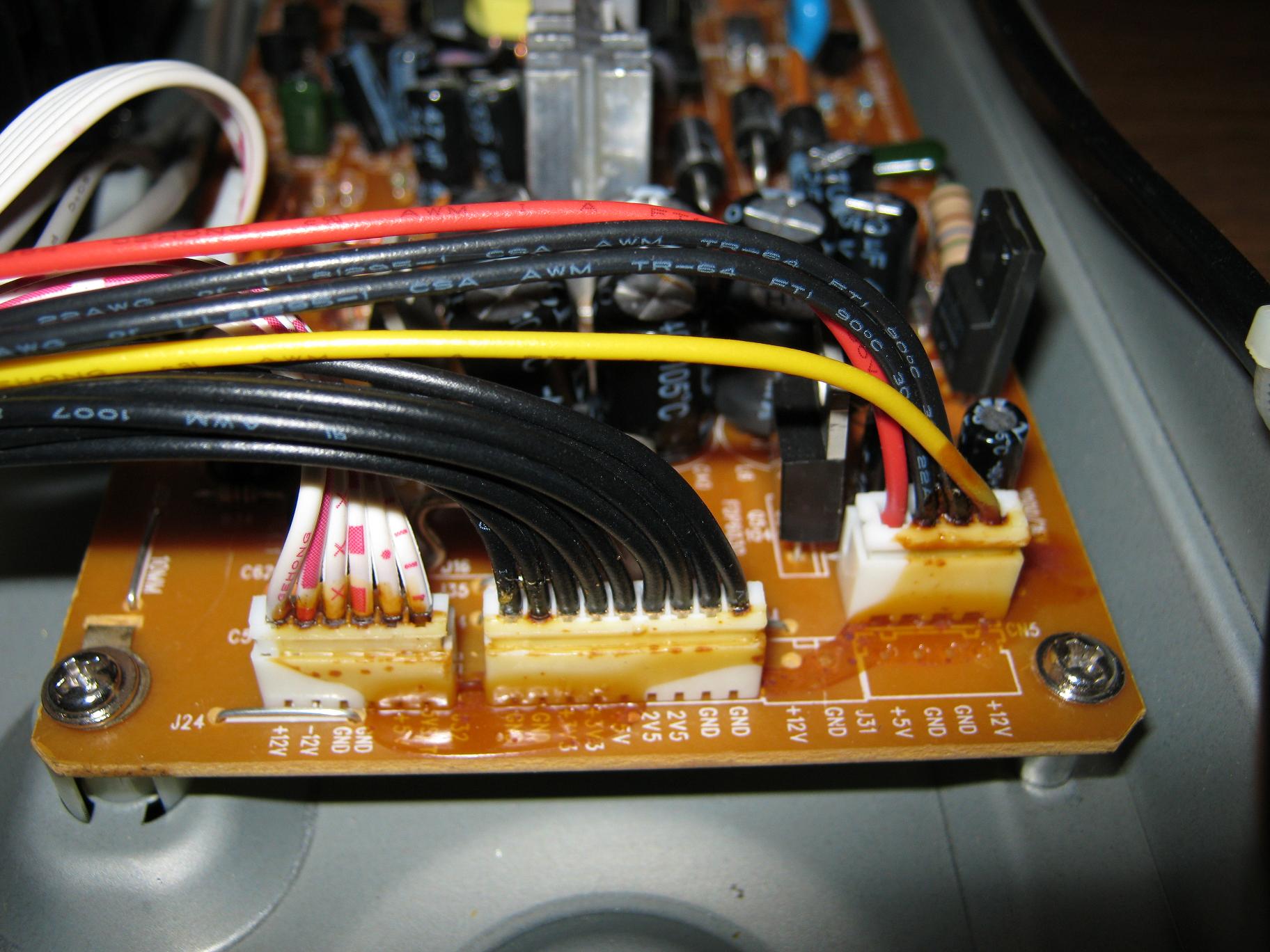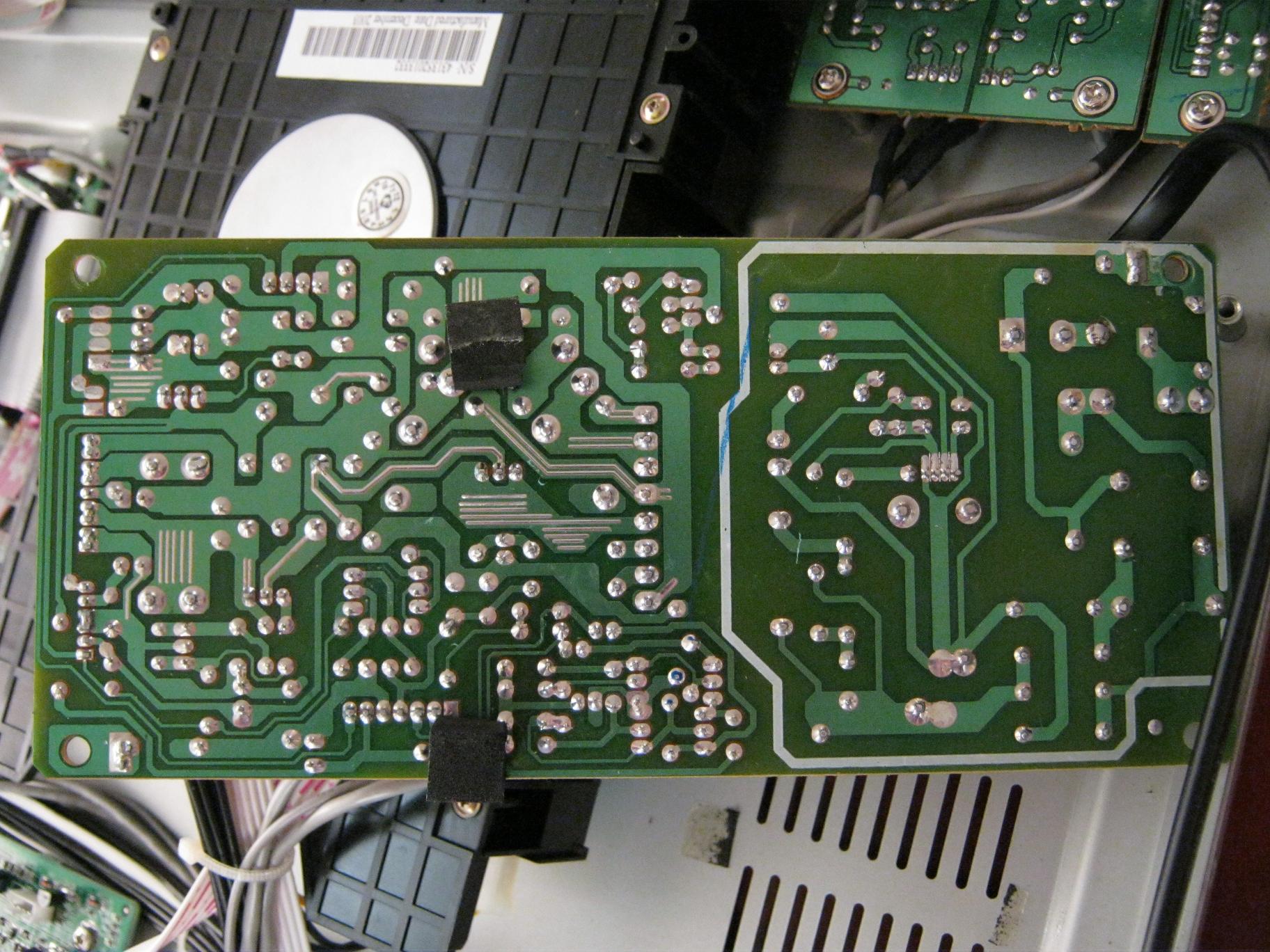 I also discovered that the main outputs are produced by linear regulators. The switching power supply produces standby power, powers the display, and feeds the linear regulators that produce +12V, +5V, and +3.3V, none of which are attached to a heatsink. There is also a +2.5V output that is created by connecting two 1N5401 diodes in parallel to the +3.3V output. The voltage drop of the diodes reduces the 3.3V to 2.5V.