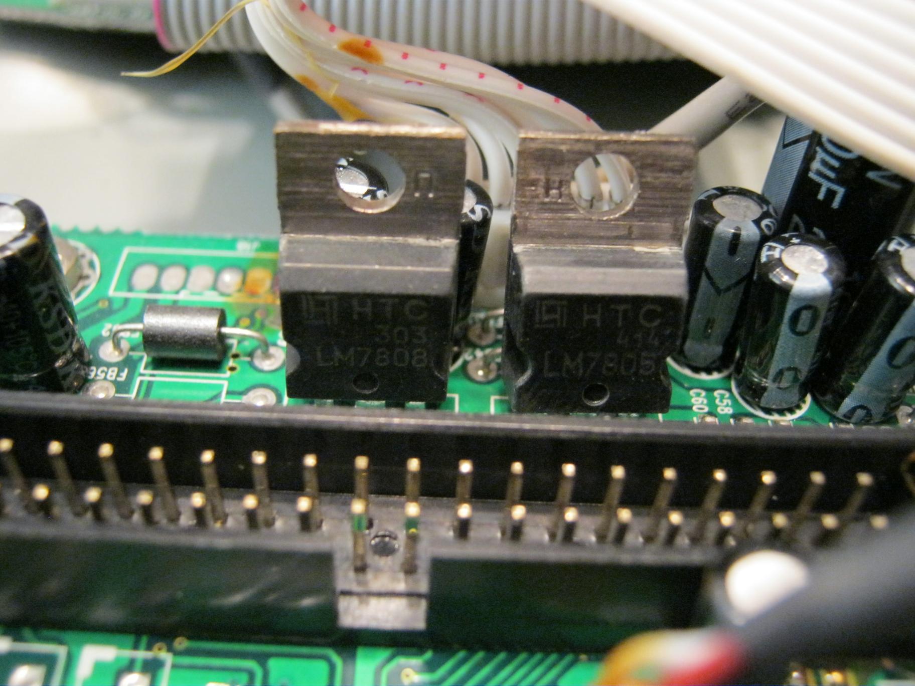 The 3.3V regulator is actually an FDP6030 MOSFET and a transistor-based control circuit. There is an identical MOSFET on the +5V output that is used as a switch to send the power from the standby output to almost all devices that require 5V. Strangely, the I/O board has its own 7805 regulator that is powered by the power supply's +12V output. The locations for the 16V caps that were originally installed are labeled for 10V caps. I replaced the +5V caps with the Nichicon PLs and the 3.3V filter cap with the 1000uF 10V I.Q, and those caps became extremely warm. I don't know if they were heated by the components around them or if they had too much ripple going through them. The Nichicons were the warmest of the four and the remaining KSD was the coolest.