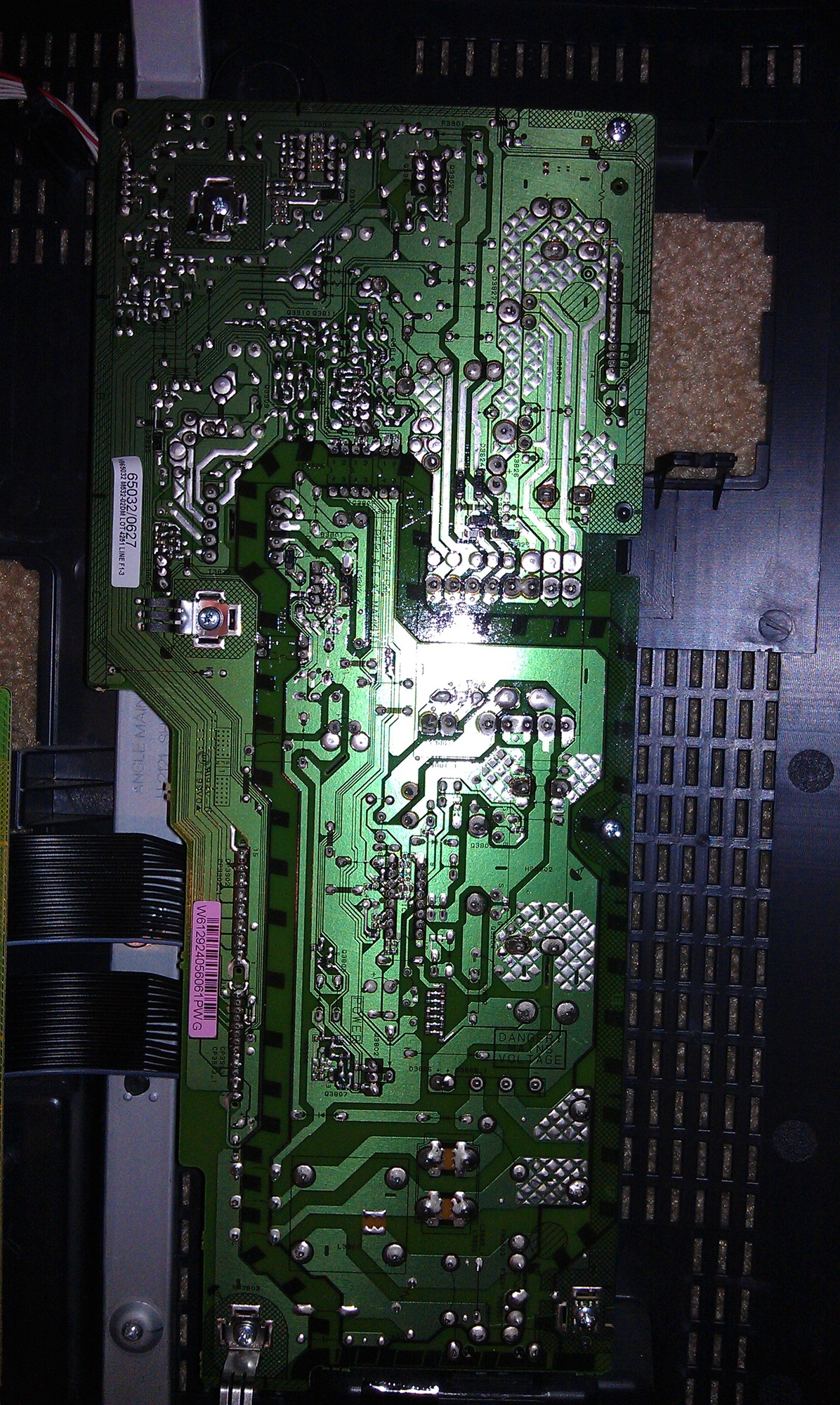 Thank you for the pictures of the power supply and the main board. They were large enough, and sharp enough to be a big help. The tcon and inverter - not so much.